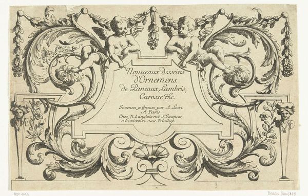 Curator: Well, isn't this a charmer! At first glance, it’s a flurry of baroque curlicues, like something that should be frosting a very elaborate cake. Editor: Indeed. What we’re seeing here is the title page of "Desseins Pour embellir Les Chaises Roulantes," or "Designs to Embellish Rolling Chairs," dating back to sometime between 1680 and 1693. It’s attributed to Alexis Loir, a print executed via engraving. Curator: “Rolling Chairs!” So, like… wheelchairs? Gussied-up wheelchairs? Editor: Precisely. Think of it as high Baroque meeting…accessibility. Note the symmetry: cherubs poised on globes, scrollwork, a crowned cartouche…It's an ode to the idea of form enhancing function, a popular philosophy for the period. Curator: I like how those cherubs are delicately balancing, like little winged acrobats showing off. And that central face—slightly melancholic, don’t you think? Is it there to remind us about the conditions that make a wheelchair necessary? Editor: It might. Faces such as that also represent classical virtues of the era. Remember, Baroque isn’t always about pure spectacle; often, embedded are subtle nods to philosophical ideas about human nature. Curator: Still, the extravagance seems a bit much. Aren't wheelchairs supposed to be… practical? Editor: It speaks to the mindset of the time. Consider that during the Baroque period, even the most functional objects were considered fair game for elaborate decoration as a statement of status, perhaps? It is a paradox - something for aiding physical restrictions embellished to be as freeing, maybe even liberating, as possible. Curator: So, an assertion of dignity and refinement, even—or perhaps especially—in the face of limitation. The details offer little stories and suddenly, it feels much deeper. Editor: Exactly. Images within images within intention. Every little symbol connects this piece to cultural ideas that run deeper than just the chair. Curator: I won’t lie. My mind still races back to thoughts of decorative frosting!