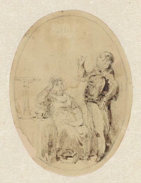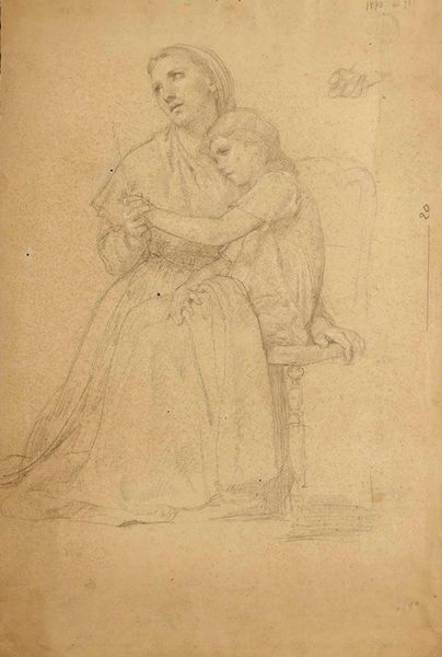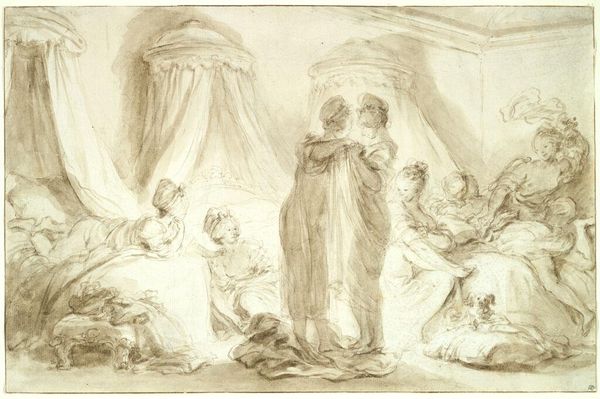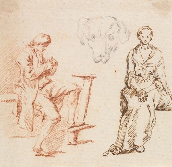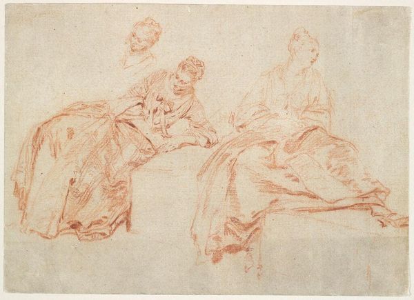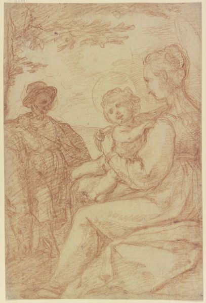 Editor: This drawing, "An Artist Painting a Portrait of a Woman and Child," attributed to a follower of Chardin, is quite charming. The use of red chalk gives it a warm, intimate feeling. What do you see in this piece, beyond the surface representation? Curator: It's tempting to view this as a simple domestic scene, but let's consider the power dynamics inherent in portraiture, especially in the 18th century. Who had the means to commission such a work, and what message were they trying to convey about their family and status? The artist, seemingly included, further complicates this. Editor: So, you're suggesting it's less about capturing a moment and more about constructing an image? Curator: Precisely. And what does it mean for a male artist to depict himself alongside his wife and child? Is it a claim to domesticity, a performance of patriarchal values, or perhaps something more subversive? What do *you* think? Editor: I hadn't considered the performative aspect so directly. It's fascinating to think about how even seemingly candid depictions can be so carefully constructed. Curator: Absolutely, remembering to examine the socio-political context of art is key.