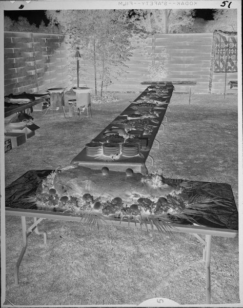 Editor: So, here we have Martin Schweig's "Untitled (view of buffet table on house patio with servers standing around bar)". It gives off this slightly ghostly, old-timey vibe, almost like a memory. What stands out to you? Curator: It's an inverted world, isn’t it? Like peering into a photographic negative, stripping away the familiar and revealing hidden truths. That garland seems less festive and more…funereal? A strange beauty in its starkness. What do you make of those figures? Editor: They're so still, almost posed. It's like a staged photo, but also like catching a candid moment. So, is it trying to say something about class or performance? Curator: Perhaps. Or perhaps Schweig is inviting us to question the reality we think we see. It's a riddle wrapped in an image, inviting us to find the questions, not just the answers. Editor: That’s a good way to put it. I see this piece a little differently now. Thanks! Curator: My pleasure. It’s a gift when art can shift our perceptions, isn’t it?
