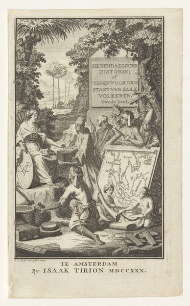 Editor: Right now we’re looking at "Three Figures from Biblical Palestine," an engraving made in 1714 by Jan Goeree. It feels a bit like a staged tableau vivant, an attempt to depict a specific time and place. What do you see in this piece, especially considering its historical context? Curator: It's fascinating how Goeree constructs "Palestine" through a very specific European lens. This image operates within a long history of Orientalism, where the "East" is imagined and represented to serve European interests and understandings. Consider, for example, how Biblical narratives were often visualized to justify colonial ambitions or reinforce existing power structures. Do you notice anything specific in the imagery that might point to a political subtext? Editor: I do see the inscription referencing ancient monuments, and it appears he's meticulously documenting a very specific location through both figuration and what looks like cartography on the bottom. Is the work implying a deep dive into a civilization on the part of the Dutch? Curator: Exactly. The act of illustrating and documenting Palestine – ostensibly rooted in Biblical history, although heavily skewed toward academic depictions— simultaneously claims a kind of intellectual ownership over that space and its history. Also, we should consider where this image would have been seen, most likely circulating amongst intellectual elites, solidifying a very particular and politicized view of Palestine within that social sphere. Who would have had access to view, engage with, and interpret this image in the 18th century, and how might it have been utilized as source material? Editor: So it’s not just an innocent illustration. It's contributing to a broader narrative and almost shaping a European perspective, through very intentional curation and choices about how this region is visualized and disseminated. Curator: Precisely! It makes you wonder about the power dynamics embedded in image-making, even centuries ago. It encourages a critical assessment of the institutional forces involved, like how knowledge about "other" cultures is produced, circulated, and weaponized to meet Europe's particular political, theological, or commercial aspirations. Editor: That really changes how I look at the image. Thank you.