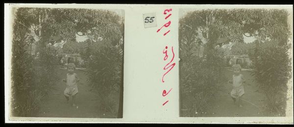 This small glass slide, titled "Plantage Accaribo," was created by Theodoor Brouwers, a Dutch artist who lived and worked during a period of significant social and political change. The photograph presents a seemingly simple domestic scene: a child stands with a ball, with an adult figure nearby. However, the title indicates we are on a plantation, likely in a colonial context. The image thus invites us to consider the complex relationships of power and identity inherent in such settings. Who are these figures? What is their relationship? Brouwers lived in a time when the Netherlands was heavily involved in colonial activities. This photograph can prompt reflections on the impact of colonialism on individual lives and the representation of these experiences. It serves as a poignant reminder of the personal stories embedded within broader historical narratives, asking us to think critically about the legacy of colonialism.