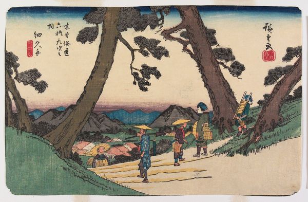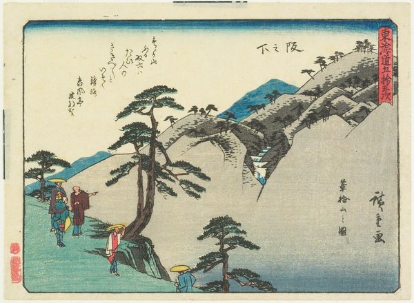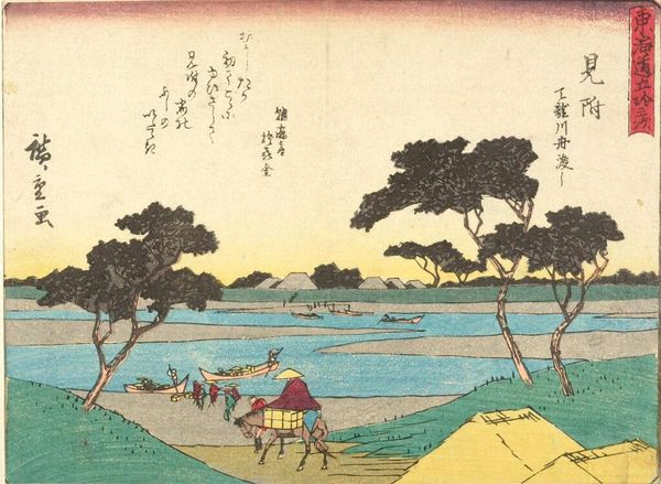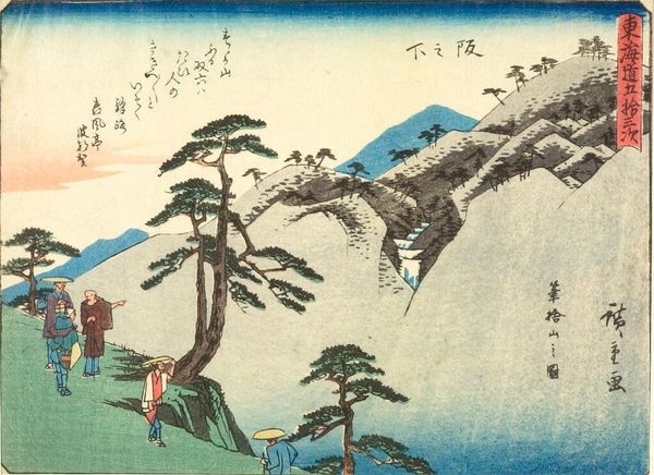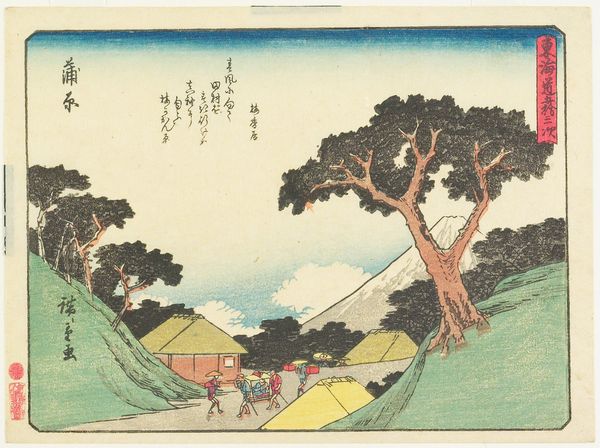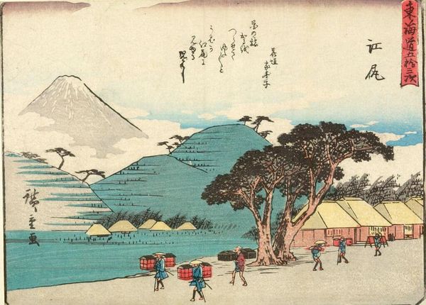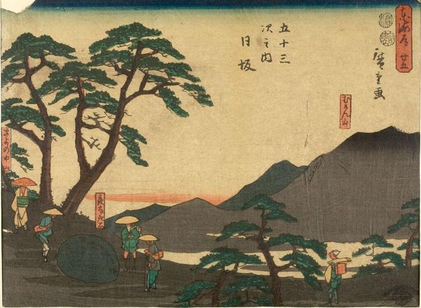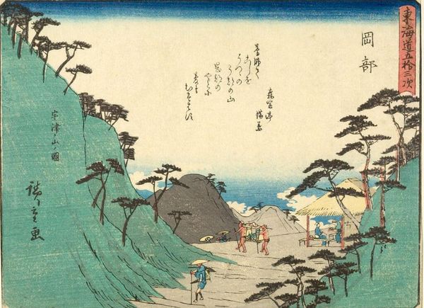 Curator: The Harvard Art Museums hold this print by Utagawa Hiroshige, titled "TOKAIDO GOJU-SAN-TSUGI." Editor: It’s striking how this image balances serenity with human activity. The landscape feels peaceful, but there are clear signs of people traversing it. Curator: Indeed. The Tokaido road was an important route. Hiroshige created many prints documenting its various stations. Note how the figures with their palanquin almost blend into the landscape. Editor: It's a powerful reminder of mobility within socio-political constraints, especially given the era's class divisions. The palanquin suggests privilege while others travel by foot. Curator: The composition also draws the eye towards Mount Fuji in the distance, a revered symbol of stability and permanence. Editor: Considering those contrasts between permanence and movement, privilege and labor, I think this print shows how art reveals the nuanced realities of its time. Curator: Absolutely. These images become documents of culture and social practice.