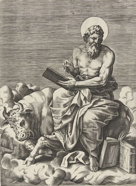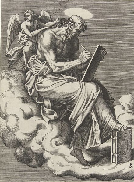 Curator: Here we have Pieter van der Heyden’s 1554 engraving, "Johannes de evangelist," now residing at the Rijksmuseum. My first impression? Dramatic, otherworldly…almost…theatrical, wouldn't you say? Editor: Indeed. The high contrast and the muscular, almost operatic depiction of St. John, complete with his eagle symbol, against those meticulously rendered clouds…it's a fascinating mix of religious iconography and Mannerist aesthetics. This was a period grappling with faith and humanism. Curator: Absolutely. He’s pensively writing, halo aglow. Is he inspired? Burdened? It’s unclear. It reminds me of a poem with really elaborate syntax, hard to follow, but full of meaning I haven’t yet deciphered. Editor: Think of the social context. Printmaking like this made religious imagery accessible to a broader public. How would people encountering such a powerful, emotive image understand its message about divinity, scripture, and maybe, their own place in a shifting world? Curator: I am captured by this small detail; the discarded, upturned book at his feet. Could it suggest a break from past conventions? Editor: Possibly. Van der Heyden may have been influenced by the evolving Protestant Reformation, emphasizing a direct relationship with scripture and challenging traditional authority. What appears as mere aesthetic flourish is a coded message of intellectual upheaval. Curator: You've given me a lot to consider, like whether the intense detail in the cloudscape adds a layer of uncertainty, challenging the concrete nature of faith in such times. Editor: I’m glad. These images, made during religious and social tumult, prompted people to ask questions about how tradition related to lived realities, whether people perceived of it or not at the time. And still invite us to think that way today. Curator: Makes you wonder how folks who viewed it centuries ago might think we see it now. Editor: Exactly, it’s a never-ending dialogue, isn’t it?