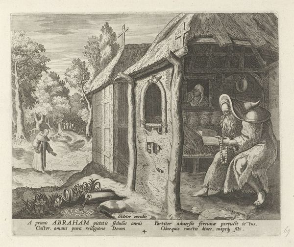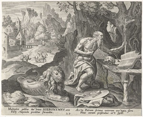 Johann Sadeler I created this engraving, *Didymus van Nitria als kluizenaar*, sometime between 1550 and 1601. The image depicts Didymus, an early Christian ascetic, deeply engrossed in reading within a secluded natural setting. Sadeler was a Flemish engraver, who lived in a time of religious upheaval during the Reformation, and Counter-Reformation, and his life reflects the intersections of art, religion, and politics. This work offers a glimpse into the spiritual practices and ideals of the period, particularly the concept of withdrawal from society to pursue a more profound connection with the divine. Note how the representation of Didymus as a hermit connects to broader themes of devotion. The snakes and dragons in the foreground are representations of evil. They symbolically reflect Didymus's triumph over temptation through his spiritual devotion. This interpretation highlights the intense personal struggle between sin and salvation, which was a central theme in the religious art of the time. The image encourages viewers to reflect on their own spiritual journeys.