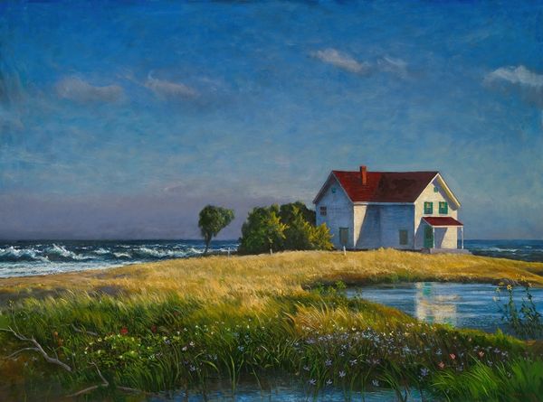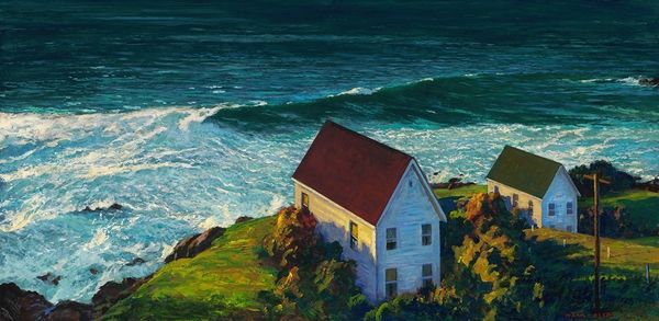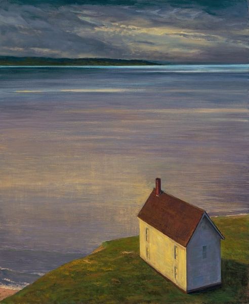 Editor: Here we have "Down East" by Mark Beck, likely an oil painting, that depicts a house by the sea. It feels isolated, yet peaceful, due to its position. The colour palette is fairly limited, creating a somber mood. What are your observations? Curator: The formal qualities immediately strike me. Observe the distinct layering: foreground of undulating land, a clearly defined middle ground with the house, and finally the recessive space of the ocean and sky. Notice how the horizontal emphasis is subtly challenged by the vertical thrust of the house itself. How do these planes interact? Editor: They create a sort of depth, pushing the house into the background, but because the colours in the house are so stark compared to the blues and greens, it also brings it to the foreground. The colours don't blend into one another. It is almost as if the house is a character. Curator: Precisely. The relationship between line and color also contributes to the dynamism. Where do you see areas where line dominates, and where does color take precedence? Editor: The horizon line between the water and the sky is very definite. The land and sea are patchier, with colour acting as the driving force. I think that is why the water seems so vast. Curator: Indeed. Note how this careful distribution avoids any sense of monotony. The artist, in a way, sets up a pictorial push and pull that engages the viewer. What is your feeling about that balance? Editor: The balance emphasises the loneliness of the landscape and of the house. The composition reinforces the feeling of being very small. I hadn't noticed how strong the horizon line was at first. Thank you. Curator: It’s a testament to the power of formal analysis, wouldn’t you agree? By dissecting the work's structure, we reveal how artists imbue paintings with expression beyond subject matter.