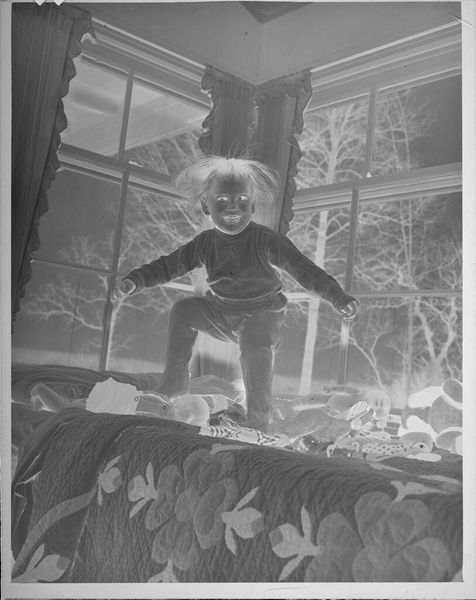 Curator: This photographic print, credited to Lucian and Mary Brown, presents a compelling inversion of light and shadow, doesn't it? It’s simply titled "Untitled (baby on couch)." Editor: Absolutely, it’s arresting. The ghostly effect creates an almost unsettling intimacy. I’m curious about the printing process itself; what kind of darkroom manipulations were at play here? Curator: The inversion definitely highlights the vulnerability of the child. It makes me think about societal expectations placed on children, and the lack of agency afforded to them within these structures. Editor: Precisely. And consider the labor involved—the photographer's choices of perspective, the materials used in the print, the chemical processes... each decision contributes to the emotional weight we experience. Curator: I appreciate how you bring the focus back to the physical creation; it’s easy to overlook the labor when the image is so evocative. Editor: And you remind us of the layers of power dynamics at play in this seemingly simple image.
