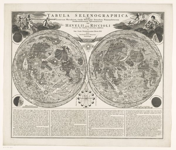 Editor: This is "Novae coelestium, terrestriumque rerum observationes" by Francisco Fontana, made around 1646. It's an engraving, so a print. What strikes me immediately is the incredible detail and contrast in the rendering of the moon. It has such depth. What do you see when you look at this? Curator: From a formalist perspective, one is drawn to the binary oppositions at play. Note, for instance, the strong distinction between the textual and visual fields. One presents a grid of linguistic structures while the other purports to provide direct observation of celestial phenomenon. Editor: That's a great point! The starkness is obvious, almost fighting each other for attention on the page. Is that the contrast you’re focusing on? Curator: Indeed. The composition can be understood in terms of binary forms, where figure opposes ground, where representation battles against language, and observation strives for dominance over theory. We are presented with visual binaries that mirror our own cognition as the mind organizes sensory input. Editor: I see, so the opposition creates tension and focuses your attention on the artwork's intent as the artist works between words and image. Did you notice the imperfections of the paper as an attribute of the artwork itself? Curator: An intriguing suggestion, indeed. A focus on the materiality of the paper draws our focus to this engraving not just as a tool of information but also as an artwork with the surface being a record of that history. And this history can change and morph over time. It can be observed that an artwork itself and not simply a tool is constantly evolving as we look, touch, and interpret. Editor: That has expanded my appreciation. I now see how the formal elements influence the relationship between image and viewer so that there is a continuous dialogue.
