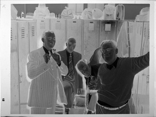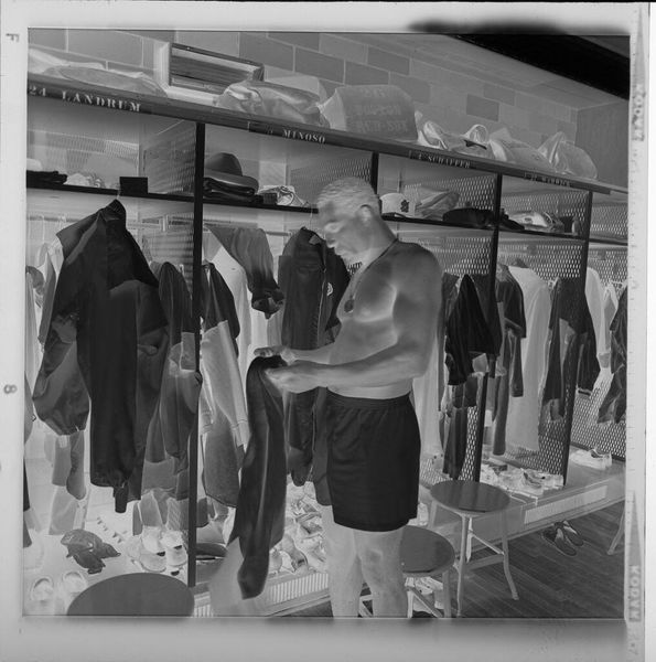 Editor: Here we have an untitled photograph by Harry Annas, of Miss Wool and Mayor Sam Glosserman in a clothing store. It's a simple black and white image, almost like a candid snapshot. How do we unpack its significance? Curator: The very ordinariness is key. Consider the social function of the photograph in the mid-20th century. It democratized portraiture, moving it away from the elite. Editor: So, this isn't just a picture of two people. Curator: Precisely. It's a document of community life, a politician using visual culture to connect with his constituents. Note the display of goods in the background. How does that affect our interpretation? Editor: It makes me think of local business and perhaps the mayor’s support for it. Curator: Exactly. It reveals the interplay of commerce, politics, and the burgeoning culture of celebrity, even on a local scale. Editor: I see now how seemingly simple photos can tell us a lot about the culture of the time. Curator: Indeed! Photography shapes the narrative of who and what gets remembered, and why.