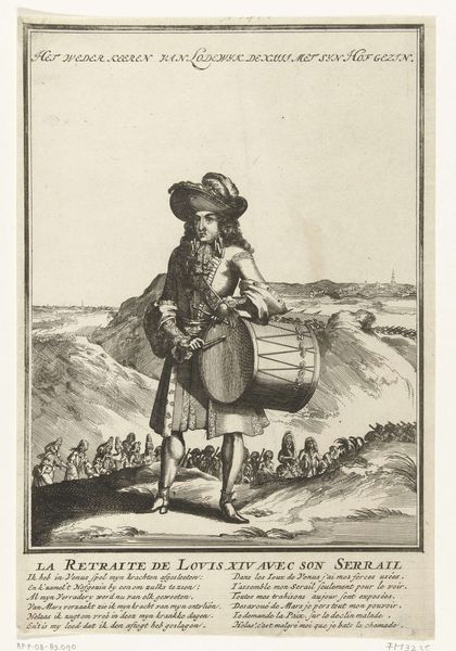 Romeyn de Hooghe created this print, "Figures à la mode, no. 7: Man in rhingrave," to capture the styles of dress during the Dutch Golden Age. The flamboyant attire, particularly the rhingrave breeches, signals wealth and status at a time when fashion was a crucial marker of identity and social position. The setting in which this man is placed, surrounded by onlookers, emphasizes the performative nature of fashion and the social gaze that comes with it. This print invites us to consider the culture of display and the ways in which individuals used clothing to negotiate their place in society. De Hooghe’s precise rendering of the fabrics and accessories is not just documentation; it is also commentary on the excesses of fashion and its role in defining masculine identity. The image evokes questions about the relationship between visibility, power, and the construction of self in the context of 17th-century Dutch society.
