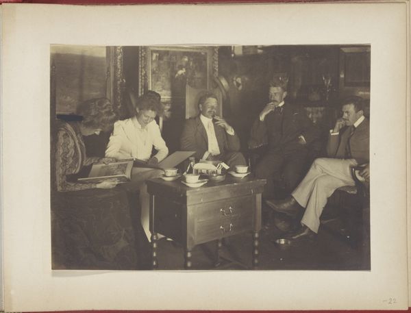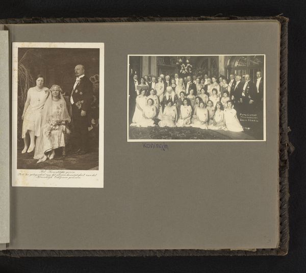 Editor: Here we have Nicolaas Schuitvlot’s photograph, “Huwelijkportret van A.H. Crone en C. Müseler…", potentially from 1914. It's a formal wedding portrait taken amidst paintings. I'm immediately struck by the floral arrangements—they're so central, almost as important as the couple! What stands out to you in this image? Curator: The prominence of the flowers absolutely catches my eye, too. It speaks volumes about the cultural significance we place on rituals of renewal. Think about it—flowers are ephemeral, a potent symbol of beauty and life's fleeting nature. Notice how they're strategically placed in front of artworks. Could the artist be commenting on the artifice of both—the constructed nature of art and of social rituals? Editor: That's a fascinating point. So you see a kind of…constructed reality being presented here? Beyond the aesthetic of it? Curator: Precisely. This photograph, styled in Pictorialism, is more than just a record of an event. The soft focus, the staged composition, the carefully arranged floral displays... They all point to a deliberate crafting of an ideal, almost a visual declaration of aspirations. The setting too—surrounded by paintings—places this union within a cultural narrative. Is this a wedding or a stage set for a play about marriage? Editor: I hadn't considered the paintings themselves as part of the message! They definitely add a layer of meaning about status and taste. I guess I saw them more as background detail. Curator: Consider how cultural memory is created through these images. Wedding photos are rarely just for the couple; they become family heirlooms, markers of lineage, conveying values across generations. Editor: So much symbolism packed into one image. I see now that it's less about simply capturing a moment and more about actively shaping its meaning. Curator: Indeed. It leaves me pondering what future generations might glean from our carefully curated images of today. A valuable lens for reflecting on both our history and present-day culture.