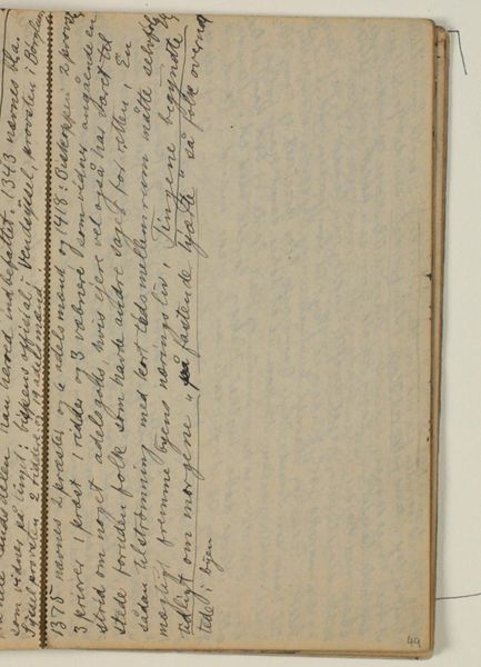 Curator: Looking at this work, "Notat" by Niels Larsen Stevns, made between 1932 and 1935 and currently housed at the SMK, it strikes me as an intimate glimpse into the artist’s process. Editor: The first thing that hits me is the quietness of the piece. The pencil on paper feels almost like a whisper, hinting at something ephemeral. You can practically smell the aged paper. Curator: Indeed, its creation coincided with a period of significant social and economic upheaval. Stevns, while perhaps not directly addressing those issues, certainly existed within them. You see an artist engaging with his immediate surroundings—the world contained within his own personal notebook. Editor: I find myself drawn to the materiality of the piece. The deliberate choice of humble materials – pencil and paper – speaks to the work's accessibility. It feels less like a precious object and more like a working document, revealing the labour behind the finished artwork. It emphasizes that the means of making this kind of "high" art don't have to be precious or grand. Curator: It certainly does humanize the artistic process. I also think it prompts us to consider the status of drawings within an artist's broader body of work. They often serve as studies, preparatory sketches for larger paintings, gaining value when made visible in public collections. This allows scholars to study process. Editor: Right, a direct record of Stevns's labour and method! Plus the inscription visible in the image—'Bisleg-overdokket veranda' which could signify place, perhaps the location of the paper where the note was taken! Curator: Yes, context is always so informative! "Notat," from my perspective, also reflects a shift in the understanding of what constitutes "art" during this time. Editor: Definitely a move toward art rooted in everyday life, revealed through simple, manual labor and honest expression. Curator: It offers a unique and invaluable view of Niels Larsen Stevns' mind, while also making me consider what a culture chooses to celebrate as artworks of public interest. Editor: I am struck again by the medium, and the sense of immediacy created. It highlights how powerful even simple acts of making can be, to inform culture about labor and materiality, as much as history.