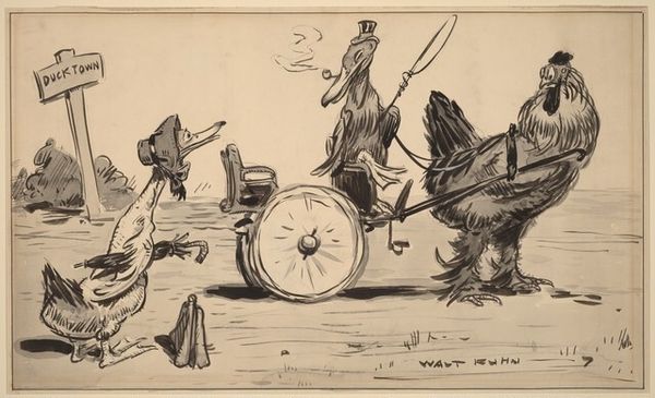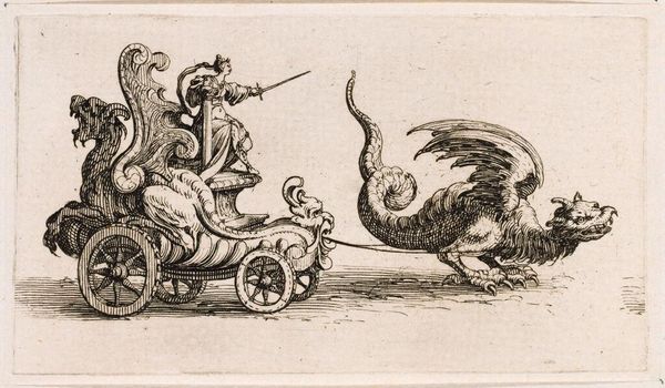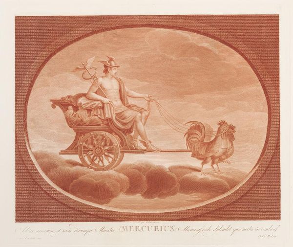 Editor: Here we have "Chariot of Mercury," an engraving by Giovanni Battista Piranesi. I'm struck by the bizarre contrast—the classical figure of Mercury being pulled by, of all things, a rooster! It feels so unexpected and almost humorous. What formal elements stand out to you in this piece? Curator: Immediately apparent is the dominance of line. Note the confident and precise quality of the engraved lines, meticulously defining form and texture. The artist orchestrates light and shadow solely through the density and direction of these lines. Do you perceive how the linear nature affects your perception of depth? Editor: I see what you mean. Because it is monochrome and lines are being used to express shading and depth, it flattens the image despite the realistic proportions and subject matter. Curator: Precisely. Consider how Piranesi uses hatching and cross-hatching, especially in rendering the rooster’s feathers, to achieve tonal variations and imbue a tactile quality. Are you familiar with any other artists who manipulate linear precision with such evocative power? Editor: Well, I'm reminded of some of Dürer’s engravings, particularly the density and detail in "Melancholia I." Though this piece seems a bit more playful than Dürer’s often heavy symbolism. Curator: An astute connection. What then do we make of Piranesi’s rendering of the human form and the rooster with a similar precision and formal concern? Might we analyze this treatment as an exploration into equivalencies, or as a purposeful leveling between mythological symbol and animal form? Editor: I suppose so. By applying a similar level of meticulous detail to both, the artist challenges any pre-conceived hierarchies we might assign to the figures. The emphasis on form then suggests the artist is using the mythology as only a subject to explore the pure qualities of representation. Curator: A thoughtful interpretation, emphasizing the agency of the artist to foreground aesthetics above traditional mythological readings. The true chariot of Mercury then, is, perhaps, the engraving itself. Editor: Thank you, seeing the art through lines definitely gives it a refreshing twist!