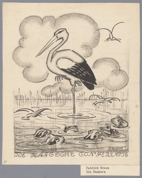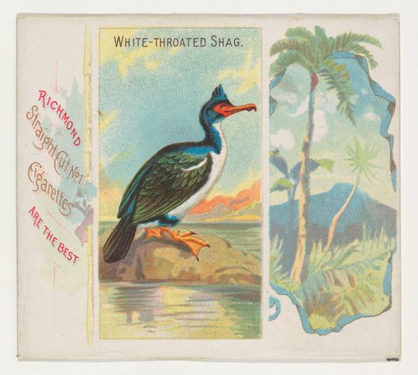 Curator: What strikes me first is the oddly melancholic mood emanating from this small watercolor print. The Shoebill stands so still, almost pondering existence itself. Editor: Before we get lost in avian angst, let's remember the purpose of this artwork. It’s a trading card from Allen & Ginter's "Birds of the Tropics" series, circa 1889. Mass-produced for cigarette packs. This wasn't about existentialism; it was about product branding. Curator: I grant that the context is commercial, but let's not dismiss the artistry entirely. Observe how the artist uses a limited palette to create a sense of depth. The subtle gradations of color give form to the bird's plumage, creating a visually complex representation. There is a certain ukiyo-e influence at play, look at the tree to the left of the bird. Editor: I see your point about color, but let's consider the material conditions. These cards were churned out en masse. The cheap paper stock, the ink, the printing process—these things dictated the final aesthetic. There’s an immediacy in the materials, a roughness around the edges that comes from speed and scale of production. The laborers assembling these cigarette packs would not be interested in the subtlety of tones but instead on the volume and efficiency that comes with manual assembly and piecework. Curator: That is a rather reductive view, no? To see it simply as an illustration diminishes the intent. The shoebill dominates the composition and has an undeniably stately and somber form, especially that gaze and beak. I do think this reflects the growing fascination with the natural world. Editor: Agreed. And it reflects a commodification of that world. These images circulated as trade flourished. Collecting these became trendy, not due to pure aesthetics but how these objects operated within networks of exchange, consumption, and class. These cards were also a signifier of modernity, of new levels of industry that had become accessible. Curator: So, despite its commercial origin, you think that we can grant artistic merit due to its naturalistic expression through materiality and design? Editor: Exactly. What we think of art needs to acknowledge social processes of making. It forces us to consider not just its image but its complicated, material life.