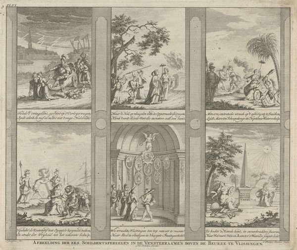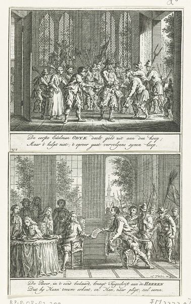 Editor: So, this engraving by Simon Fokke, created between 1764 and 1766, is titled *Bestorming van de Noordpoort te Middelburg, 1672*, or *Storming of the North Gate at Middelburg*. It’s a complex scene, split into two sections, and really detailed despite its small scale. What historical narratives or social commentaries do you see playing out here? Curator: Well, it is interesting that this print was created almost a century after the depicted event. I’d say this image should be viewed as a historical representation, but also a politically charged commentary for its own time. Fokke chose a pivotal moment from the Franco-Dutch War, specifically the siege of Middelburg. The lower register displays violence and upheaval, contrasting with the seeming order in the upper one. This points towards the public's anxieties, as well as the civic responsibilities towards a protective leadership. What audience did this image serve? Editor: I imagine this print served to remind people of the conflicts of the past. Would it serve as a reminder of the cost of wars? Curator: Precisely. The artist created this scene to remind the people of their city's endurance and to think critically about warfare and public service. These sorts of prints are powerful tools of shaping public opinion during times of social turbulence, because this visual form could spread ideas quicker. Are you noticing how the scene's layout directs your reading? Editor: Yes, how the chaos on the bottom half is connected to the political figures at the top who might or might not do anything to calm that turmoil. It all reflects the concerns of the population who depend on this protection, and want to see how people respond in the midst of turmoil. Curator: That's precisely it. Prints like this demonstrate art's ability to serve not only aesthetic purposes, but to participate actively in society by prompting conversation and shaping public memory. What does this image tell us about the role of art? Editor: That art can be both a historical document and a commentary, prompting us to question the motives of historical representations, who makes them and when. Curator: Indeed. This intersection enriches the way we understand our history through art.