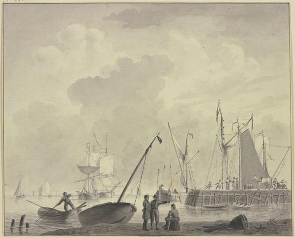 "Driemaster en andere schepen in stil water voor de kade," or "Three-master and other ships in calm water near the quay," is a monochrome watercolor on paper by Frans Arnold Breuhaus de Groot. Painted during a time of vast colonial expansion, the image of ships carries a heavy weight. Though seemingly placid, it reminds us of the machinery of global trade, and the many lives impacted by the restless movements of goods and people across water. De Groot was a Dutch artist, living in a nation whose wealth was tied directly to its maritime power. The calm, muted tones belie the violence and exploitation inherent in this industry. This work invites us to reflect on the complex relationship between the aesthetic beauty of maritime scenes and the economic systems they represent. It compels us to consider whose stories are elevated and whose are obscured within these historical depictions.