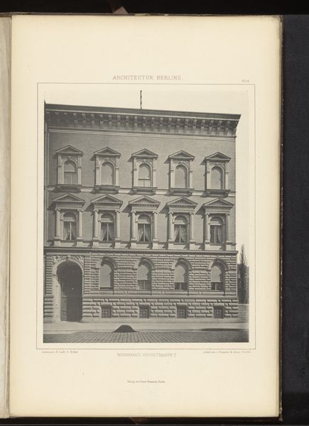 Curator: Immediately striking, isn’t it? This photograph captures a façade on Leipzig Strasse in Berlin, sometime before 1877. It’s currently held here at the Rijksmuseum. Editor: It feels…imposing. Solid, impenetrable. Almost aggressively symmetrical. All those rectangles, neatly stacked. Like a cake made of stone. Curator: The architecture, rendered in detailed monochrome, certainly presents a study in geometric formalism. Note the balanced arrangement of windows, the emphatic cornices, and the subtly projecting central bay. One could argue the composition speaks to the aspirations of nascent German nationhood: order, strength, and prosperity all captured in stone. Editor: Orderly yes, prosperous I'm not so sure about. The overall effect is a tad gloomy, don’t you think? All those closed windows seem to stare out blankly. I wonder what stories are hidden behind them. It could be the portrait of perfect upper class propriety... or something altogether more…dark? Curator: Perhaps. But observe how the photographer has used light and shadow to articulate depth and volume. This modulation avoids flatness, revealing the distinct textures inherent within the stonework. Editor: Yes, there is that textural interplay. Still, beyond the technical aspects, the building speaks, doesn't it? Maybe of secrets, longings, the ghosts of forgotten lives. Do you think it housed one large family, or perhaps multiple apartments? Each with its own internal drama? Curator: Speculation, of course, moves beyond strictly formalist considerations, though the interplay you posit does complicate readings of urban life in the period. Consider the implications if the building housed a diverse range of social classes. How do these formal structures shape lived experiences? Editor: And were they happy? That building feels like a stern headmaster. Hard to imagine joy echoing from its depths. Curator: Ultimately, as a record of a specific architectural moment, this photograph grants insights into aesthetic and cultural priorities. Editor: Yes, and those stone walls remind us that sometimes even buildings keep their secrets better than people do. A melancholy grandeur, locked away.