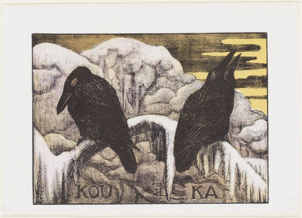 Curator: Looking at this, the first thing that strikes me is the sheer graphic power. It's quite striking! Editor: Indeed. We’re standing before the “Omslag zakkalender voor Van Houten Cacao,” or Calendar Cover for Van Houten Cacao, created by Theo van Hoytema in 1903. It’s a woodcut print currently held here at the Rijksmuseum. Curator: Van Houten Cacao? So this was advertising? The labour involved in creating such a detailed print for a commercial product fascinates me. Was it typical for that time? Editor: Absolutely. The turn of the century saw a boom in advertising, and artists frequently lent their talents to promoting consumer goods. What I find intriguing is the choice of imagery - these solemn ravens perched amidst the stark winter landscape. Cacao is comforting, why this somber theme? Curator: Maybe the artist had an ironic sense of humor! It’s clever. Though I am more intrigued by how the printmaking process informs our understanding. Notice how the textures have been built with what appears to be layers and cross-hatching. It reminds us this image exists through production; its status shifts the focus from artistic concept to object to be acquired. Editor: A very valid point. And one could argue the use of woodcut, a more "common" printmaking medium, speaks to accessibility and the brand's desire to appeal to a broader public. It's worth considering, too, the cultural symbolism of ravens – traditionally associated with ill omen, death, but also wisdom. It’s a clever play of familiar and, dare I say, subversive, imagery within a capitalist framework. Curator: And let's not ignore the watercolour illustration qualities. Despite its commercial context, the treatment of the subject has a very strong relationship with Symbolism, elevating it beyond its immediate function. Editor: So, more than just selling cacao, it’s selling an idea of, perhaps, the ‘dark side’ of comfort. Or simply tapping into that fin-de-siècle fascination with the macabre. It makes you wonder, what kind of visual landscape did folks expect back then to advertise comfort food? Curator: Exactly! The image offers a multi-layered, almost anthropological record. Fascinating how examining material culture allows one to excavate histories often left unacknowledged by “fine art.” Editor: Agreed. Considering its public function and context gives us richer insight, and perhaps changes how we view both the image and those for whom it was intended.