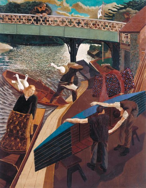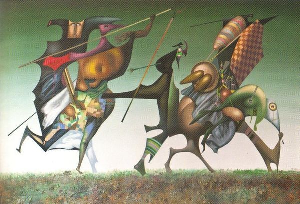 Neo Rauch's painting, Die Kontrolle, presents a fragmented scene rendered with flat, bold colors and a disjunctive composition. The work is divided into two panels, each a jumble of figures and objects that seem to exist independently. A palette of vibrant blues, greens, and reds clashes with a stark pink wall, creating a visual discord that is both jarring and intriguing. Rauch destabilizes established meanings by juxtaposing seemingly unrelated images. This reflects a poststructuralist concern with the instability of language and the impossibility of fixed interpretation. The painting invites us to question the narrative coherence and to consider how meaning is constructed through the arrangement of disparate elements. Each signifier - each figure, color, or shape - functions within a complex semiotic system, creating layers of potential interpretation. The formal qualities of this painting - the fractured composition, the clashing colors, and the ambiguous figures - function as a means of exploring the fluidity of meaning. The visual disjunction challenges the viewer to actively construct their own understanding, recognizing that art does not offer fixed answers but rather opens up new possibilities of interpretation.