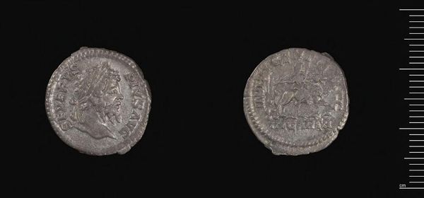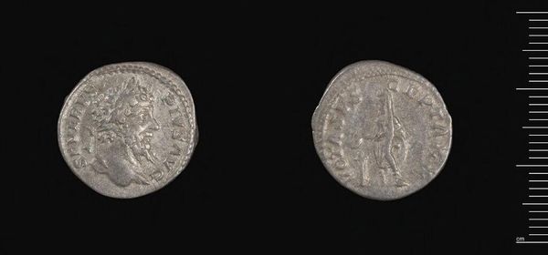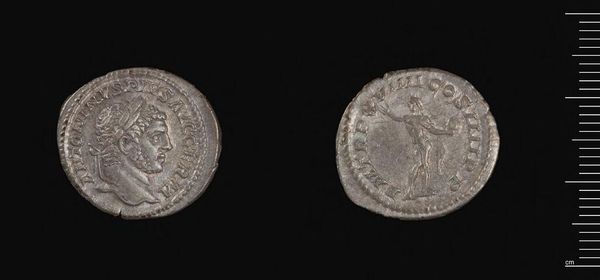 Editor: This is a Denarius of Caracalla. It's quite small, but the detail is amazing. What strikes me is the stark contrast between the profile and the figure on the reverse. What can you tell me about the composition? Curator: Observe the rigid geometry. The circular format tightly frames the bust and figure, emphasizing the limited space. The inscriptions, though worn, form another layer of containment. Note how the relief flattens, prioritizing symbolic legibility over naturalism. Editor: So the form itself communicates a message? Curator: Precisely. The coin's design speaks to imperial power through controlled, deliberate form. Consider the medium itself; a coin's intrinsic value is secondary to its symbolic function. Editor: That's a fascinating point. I'll look at coins differently now. Curator: Indeed, analyzing the formal elements provides a crucial entry point to understanding the object's historical and cultural significance.