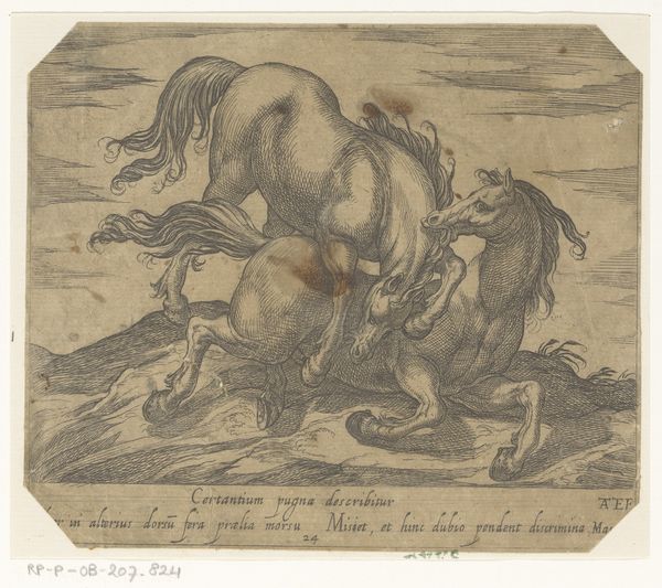 Antonio Tempesta created this engraving of a horse galloping to the right. Notice how the horse dominates the composition, its dynamic posture and musculature rendered with remarkable detail. The artist masterfully uses line and shading to create a sense of movement and energy. Tempesta employs a formal structure that elevates the animal to a symbol of power. The backdrop, featuring clouds and classical ruins, provides an atmospheric context that doesn't detract from the horse's commanding presence. The interplay between the organic form of the animal and the geometric precision of the engraving technique is also striking. The engraving functions as a sign within a visual language. The horse, depicted with such vitality, becomes more than just an animal. It represents freedom, strength, and perhaps even a commentary on the relationship between nature and civilization. This interplay invites us to consider how form and content intersect to create meaning.