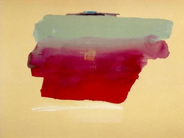 Curator: Looking at Helen Frankenthaler's "Black-Eyed Susan" from 1988, it’s hard to ignore the feeling of spaciousness that this acrylic painting evokes. What's your immediate impression? Editor: Light. Almost ethereally so. The layering of washes—pink melding into the bright yellow—creates an atmospheric perspective that suggests an expansive landscape. Curator: Frankenthaler, notably connected to color field painting, abandoned brushes at times. Here, we see washes and staining techniques allowing the paint to soak directly into the canvas, blurring boundaries and solidifying the flatness of the picture plane. Editor: Flatness is key, but within that, Frankenthaler initiates dialogue regarding landscape. It's fascinating considering abstract expressionism’s trajectory, particularly how her work intersected with second-generation artists navigating post-war visual culture. Abstraction became almost democratized and extremely relevant within larger socio-political contexts. Curator: Exactly. Take for example the dynamic tension between form and formlessness created by the translucent layering and opacity near the top and right edges, which leads one to feel an underlying structure fighting with the looseness of gesture. How does the materiality of acrylic here help deliver Frankenthaler's idea? Editor: Acrylic's fast-drying quality and adaptability allowed her to build up layers quickly. The visible brushstrokes and staining are intentional records, perhaps testaments to individualism even amid institutional trends. Curator: Consider the work's title juxtaposed with its presentation. We understand black-eyed Susans to be rather ordinary daisies with simple forms and striking black centers, yet Frankenthaler has captured this common beauty through extraordinary formalism. Editor: Yes, and if Frankenthaler were trying to represent a botanical object precisely, she may not have captured what the essence of nature does for the collective social imagination. Her approach reminds the observer to consider art as active agent of transformation rather than passive decoration. Curator: Considering those color interactions and compositional dynamics makes for a truly rich interpretation. Editor: Yes, looking at art in light of our cultural experiences can be a really helpful exercise, and thanks to abstraction and unique artistic processes, viewers come that much closer to a sense of possibility.
