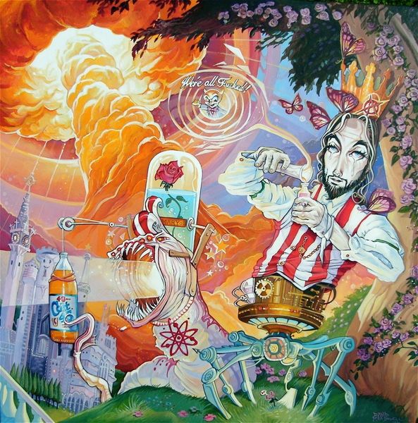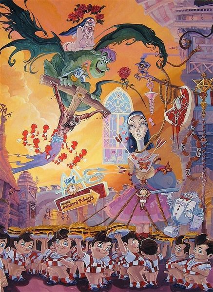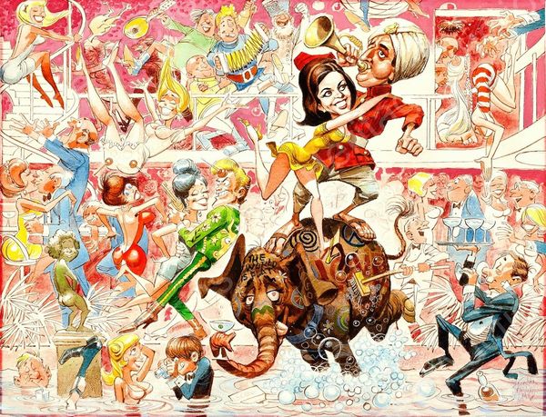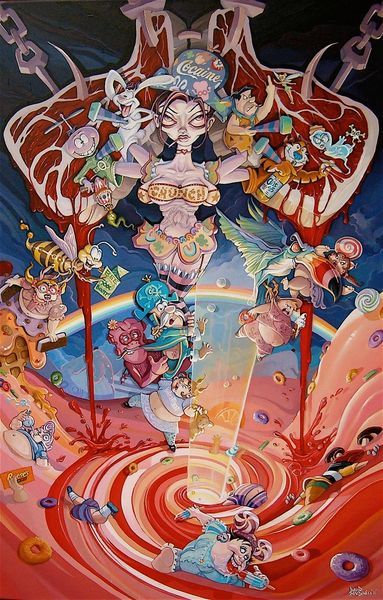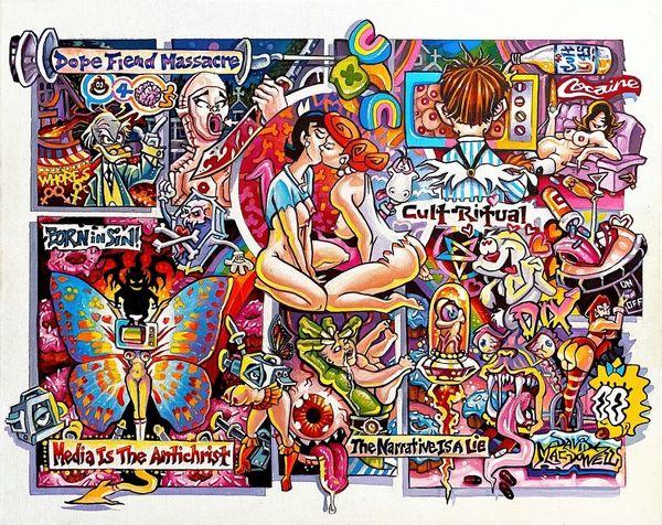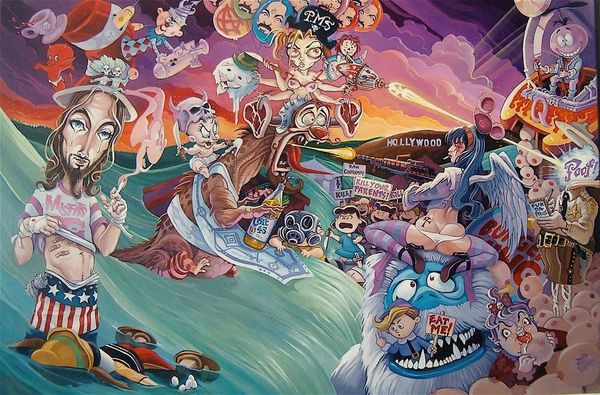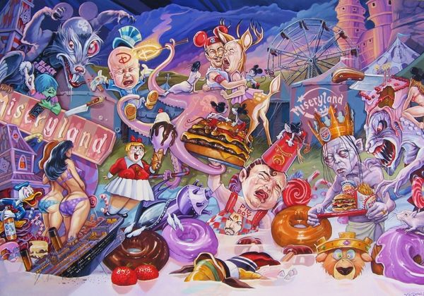 Editor: This is Dave Macdowell's "Frustrated Incorporated," created in 2010 using acrylic paint. The image is packed with characters that seem simultaneously familiar and… corrupted. I'm getting a strong sense of unease mixed with, like, satirical social commentary. What do you see in this piece? Curator: Well, it screams of institutional critique doesn't it? Macdowell seems to be dissecting the commodification of childhood innocence. Notice how iconic figures, the very bedrock of corporate entertainment, are twisted into grotesque parodies. The name itself, "Frustrated Incorporated", points to the inherent contradictions and potential for disillusionment within these powerful systems. Editor: That's interesting. I was mostly stuck on the shock value of seeing these beloved characters vandalized. So, you're saying there's a deliberate political intention behind the unsettling imagery? Curator: Absolutely. Consider the backdrop. It's a nightmarish funhouse mirror reflection of consumer culture. He's not just playing with shock value; he's actively challenging the narratives we're fed from a young age. Do you think Macdowell is condemning the dreams sold by institutions? Editor: Maybe. There's almost too much to unpack, you know? I mean, between the erotic elements and the almost Dadaist juxtaposition of themes, I wasn't even sure where to start looking for deeper meaning. Curator: Exactly! That overwhelming feeling is part of the point. He throws all these loaded images at you, demanding you question the role of corporations, consumerism, and even our own complicity in perpetuating these narratives. Macdowell invites conversation regarding late stage capitalism! Editor: I see. So, the overload is itself a commentary on the relentless nature of these cultural forces? It makes me wonder about the line between entertainment and indoctrination... Curator: Precisely. And what happens when the promise of that entertainment falls short, leading to... frustration? A clever tactic Macdowell employees. It challenges you to ask more questions about our shared values and collective expectations. It is not always pleasant, but we grow nonetheless! Editor: This definitely gave me a lot to think about - a lot more than meets the eye! Thank you. Curator: The pleasure was all mine. Now, to consider how such artwork may affect broader cultural movements of the 21st century…