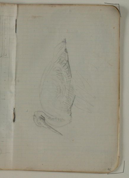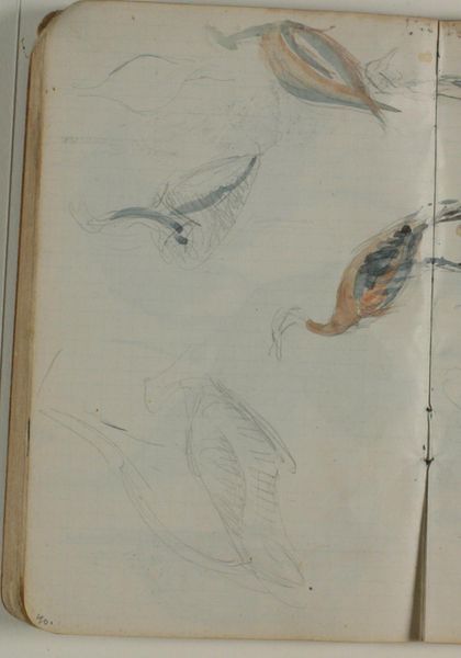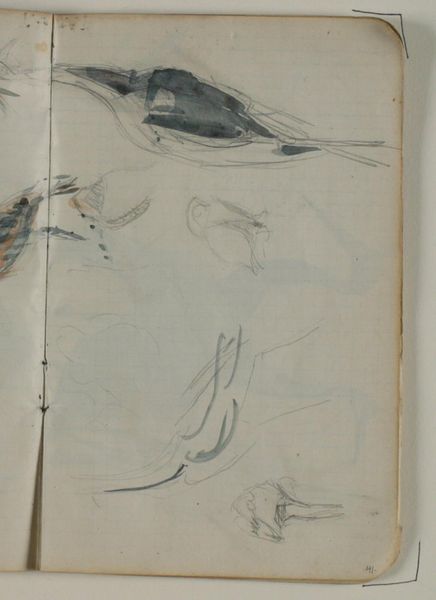 Editor: Here we have "Skitser af traner," or "Sketches of Cranes," by Niels Larsen Stevns, made between 1900 and 1905 using pencil on paper. It's housed here at the SMK. The quick strokes give the whole image a fleeting, almost ethereal feel. What do you see in this piece? Curator: I see an attempt to capture the essence of the crane – a creature often associated with longevity, happiness, and freedom. The sketches remind me of earlier traditions where cranes were symbolic messengers, spirits taking flight between worlds, a symbol that recurs globally from Japan to Greece. Editor: That's fascinating! The idea of them as messengers adds a whole new layer. Do you think the artist intended that symbolism? Curator: Perhaps consciously, perhaps not. Symbols often operate on a deeper, more intuitive level, drawn from the well of shared cultural memory. Stevns may have been channeling these associations without actively thinking about it. Notice the delicate lines – they don't define a concrete form, but instead, a feeling, an idea of flight and grace. Are they flying away from the lower picture? The picture on the right page contains some figures of birds too? Editor: That makes sense. The lack of detail makes them seem more universal. I was so focused on the lightness of the image, I hadn't considered how the symbolism deepens that feeling. The whole sketch comes alive in a different way now! Curator: Indeed. Art allows us to tap into those shared meanings, connecting us to a much larger story. Each viewing opens up the symbolisms even more, every time anew. Editor: Absolutely! This has definitely given me a lot to think about and another view on Niels Larsen Stevns’ art. Thanks so much!