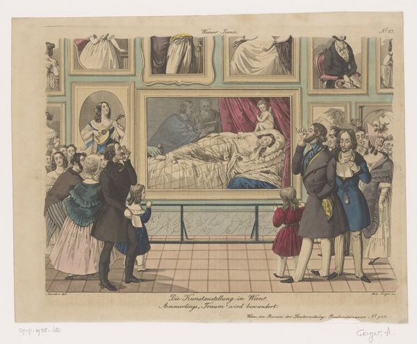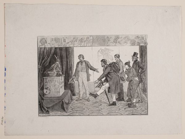 Editor: This is "Fattigbestyrerdjævlen," or "The Poor Law Devil," made around 1831 by Søren Schiøtt. It’s an engraving with watercolor on paper, and what strikes me is how theatrical and almost comical it looks, even though it seems to be addressing poverty. What do you make of the figures, and their somewhat beastly appearance? Curator: Ah, yes, Schiøtt. It reminds me of a darkly comedic puppet show. Each character, rendered with such exaggerated features, seems caught in a tragic dance. The fox-headed figure and the devilish character are not just visually striking; they speak volumes about the artist's critique of power structures. I feel the work is saying something important about societal wolves in sheep's clothing, or devils promising aid but delivering misery. What do you think that might be? Editor: It’s interesting you see it as a critique. The bestial figures make me think about dehumanization – how the powerful can strip people of their dignity. Curator: Absolutely, the artist is definitely exploring that uncomfortable space. And what about the captions that come out of the characters’ mouths? Editor: Right. So, one side seems to be flattering, “I’ve known you as a most outstanding man, a most honourable man! … I humbly ask on behalf of the French!” And the other looks like excuses, blaming circumstances on the people who are requesting aid: “There are people and then we have people”. I suppose what makes me question my assumptions is whether those with money *have* somehow “earned” what they own in some way. Is this critique just another version of being envious? I like it precisely *because* it creates that kind of internal tension in the viewer. Curator: I love that it provokes those tensions in you. Schiøtt's work, to me, acts like a distorted mirror reflecting our own moral complexities and our never-ending dance with difficult questions. I feel richer from considering it! Editor: Definitely. This makes me look differently at other satirical artworks; to find a similar playfulness but also social commentary.