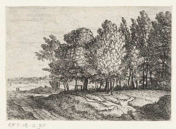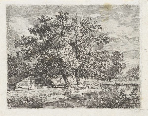 Editor: So this etching is called "Landschap met sloot en boerderij," placing it somewhere between 1842 and 1882, created by Adrianus van Everdingen. I find the texture quite interesting - all these intricate lines to compose the landscape. How would you interpret this work through its visual elements? Curator: Certainly. Notice how Van Everdingen employs line weight and density to establish spatial relationships. The foreground, depicted with darker, more closely packed lines, appears to advance toward the viewer. Conversely, the background, rendered with finer, lighter lines, recedes. Consider also the interplay of light and shadow, achieved solely through this meticulous etching technique. The subtle gradations suggest atmospheric perspective, creating depth within a monochromatic palette. Editor: That's a good point about how the hatching creates depth and imitates light and shadow so convincingly despite being an etching. It's clever how line variations are the only thing available to render such detail! Curator: Precisely. Note too the balanced composition – the placement of the farmhouse on the right is counterweighted by the cluster of trees on the left, preventing the image from feeling unbalanced. Observe the deliberate use of vertical lines in the trees to offset the horizontal expanse of the land and water. In the final analysis, it's a compelling study of form and technique. Editor: Seeing how Van Everdingen creates depth, texture and balance solely through line and form makes the piece much more remarkable than I first thought. Curator: Indeed; by restricting his palette and relying on line alone, van Everdingen focuses our attention on the foundational elements of visual representation.