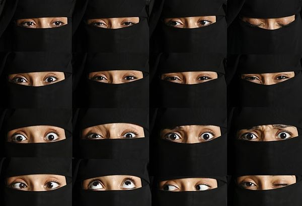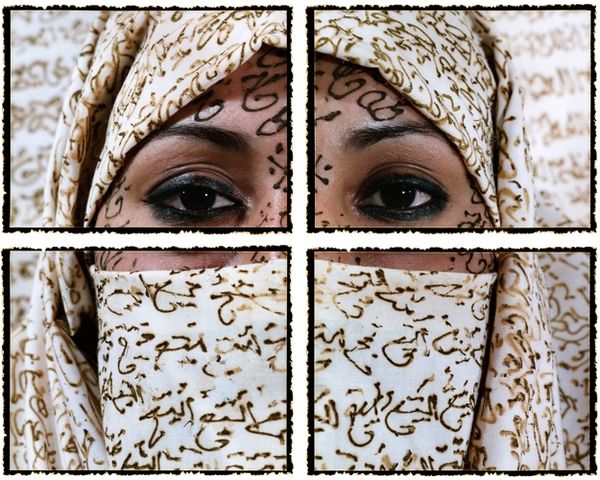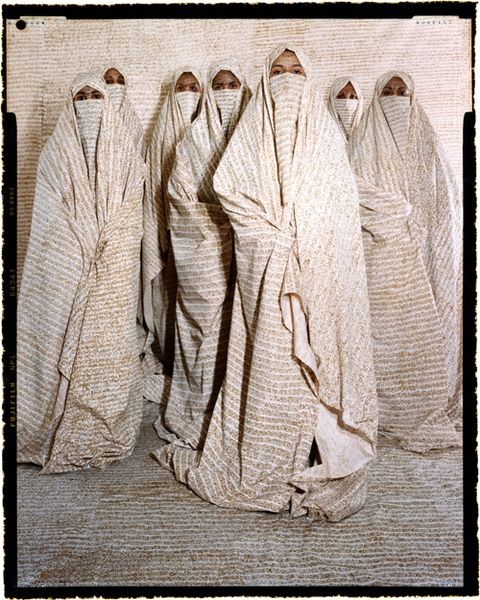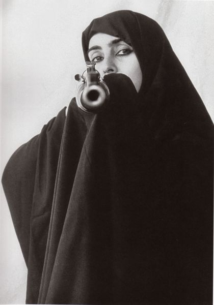 Curator: There's an undeniable starkness to this photograph. The monochrome palette creates such high contrast and deep shadow; it practically radiates severity. Editor: I agree. It’s a deliberate choice that heightens the impact. What we're looking at is Shirin Neshat’s "Rebellious Silence," from 1994, a gelatin silver print that's part of her "Women of Allah" series. It became immediately iconic for so many reasons, embodying so much of the political struggle within Iran at that time. Curator: For me, the focal point is definitely the gaze—intense, unwavering. But then you see the rifle bisecting the composition, its rigid line interrupting the soft curves of the hijab. The weapon immediately symbolizes the politicization of women's bodies and the contradictions of the revolution. Editor: Precisely! The text overlaid on her face are lines of Persian poetry—poems by women. It merges the personal and the political, where her own visage becomes the canvas for resistance literature. Her covered body becomes a site of profound contention and challenges simplistic ideas about agency. It's not a document about piety; it's a study of power. Curator: I keep thinking about that gaze… It reminds me of ancient icon paintings. Those images, too, communicated defiance and power. Despite cultural changes over the centuries, some symbolic languages remain recognizable: direct eye contact as a visual assertion. What a powerful connection there, and yet a great paradox of contemporary struggles depicted with historical techniques. Editor: Absolutely. Neshat layers so many coded messages to dissect the cultural forces at play. While her series initially drew criticisms from some Iranians who thought she perpetuated orientalist stereotypes for a western audience, its potency rests in exploring identity, not defining it. It challenges western viewers as much as it scrutinizes her own culture, rejecting any easy binaries or conclusions. Curator: This work demonstrates the complex interplay of memory, identity, and symbol. It speaks across different cultures to communicate a powerful narrative. Editor: It stays with you, doesn't it? Beyond aesthetics, “Rebellious Silence” serves as a powerful visual essay about gendered social space, agency, and multifaceted representations.