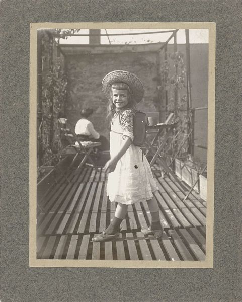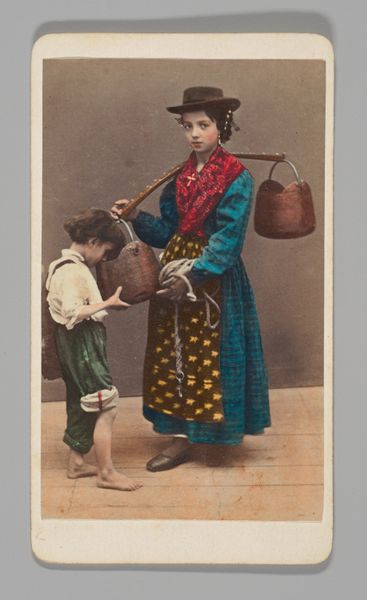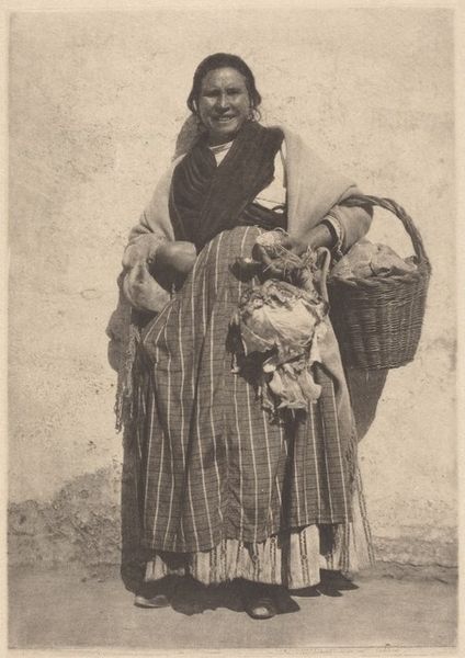 Curator: This photograph is titled "Nazareth. A Peasant Girl," by Karimeh Abbud. The medium is listed as both print and photography. Editor: The light! It’s so even, almost…soft. And the girl's gaze, it cuts right through. A touch melancholy, wouldn't you say? But strong too, there’s a kind of serene dignity. Curator: Indeed. There is a palpable strength in her stance, as well. Observe the pot balanced effortlessly on her head. It’s almost like a crown. Beyond its obvious utility, what do you think that object conveys about identity and lived experience in this context? Editor: Well, the pot itself is pretty unassuming, but its symbolic resonance echoes ancient ways of life where balance – both literal and metaphorical – was essential. It evokes themes of daily labour, but also resilience and an intimate relationship with the land. Her simple dress, worn hands…they all speak to that groundedness. Curator: Abbud, working in the early 20th century, consciously adopted a portrait style influenced by orientalism, capturing individuals and communities often rendered invisible by mainstream narratives. The image partakes in visual codes that, despite their undeniable problematic legacy, granted these portraits a sense of… authority. Editor: Authority… but also distance. Doesn't the very act of "capturing" risk exoticizing? There’s this tension isn’t there, between witnessing and… well, voyeurism? We're observing someone else's ordinary life, framed and presented for our consumption. Is there an echo here with religious paintings of the holy mother who stands in wait? Curator: It's a poignant point. And it raises the question of how we, as viewers today, navigate these images with empathy, curiosity, but also with a critical understanding of their historical framework and biases. Editor: Ultimately, it’s about recognising her – this peasant girl of Nazareth – not as a distant “other,” but as a fellow human being who can both carry a heavy weight and return an unshakeable gaze. That is where she transforms from object to active witness, and reminds us that we too bear the weight of our own stories. Curator: I agree entirely. The image serves not merely as an echo from a bygone era but more importantly as a resonant conversation partner today. Thank you.