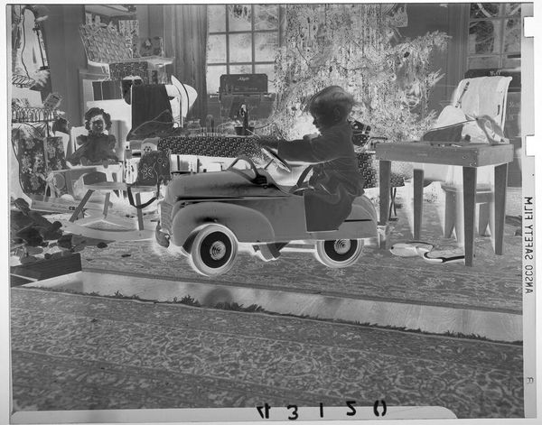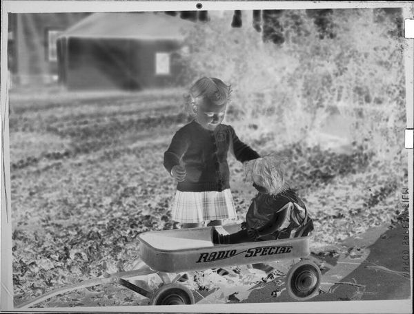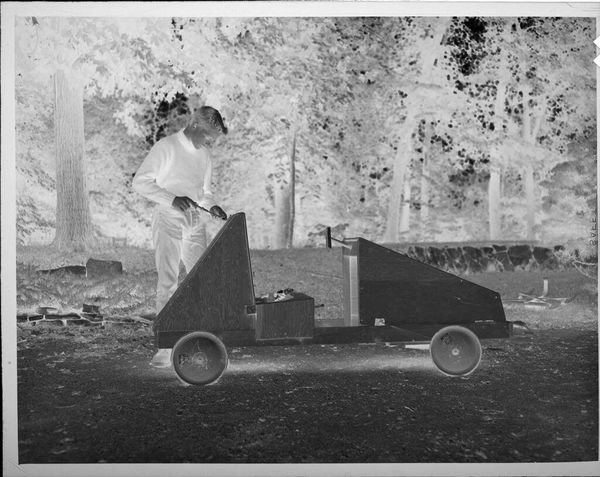 Editor: This small, undated photograph by Lucian and Mary Brown, titled "Untitled (two boys riding in cart)," has such a strange, dreamlike quality because of the reversed contrast. What symbols jump out at you? Curator: The cart itself feels symbolic. Carts often represent journeys, literal or metaphorical. And the shared ride evokes camaraderie, a shared path. But the inverted image... it feels like looking at a memory, faded and altered. Editor: So, you see it as a representation of childhood memory and friendship? Curator: Precisely. The reversed image gives the scene a haunting feeling, a fleeting moment captured. It shows how symbols in visual imagery evoke nostalgia. Editor: That’s a beautiful way to look at it. It really brings out the emotional depth. Curator: Indeed. It speaks to the enduring power of simple images to carry such weight.