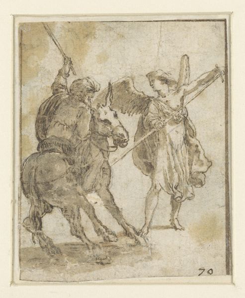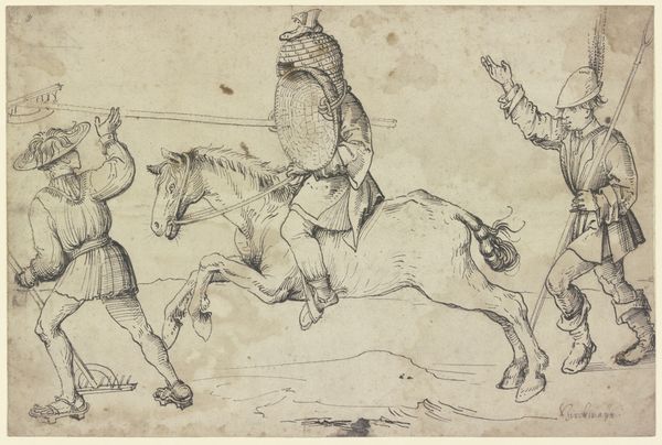 Editor: Here we have Pseudo-Pacchia's "Marcus Curtius Leaping into the Abyss," a drawing made around 1530, using pen, ink, and charcoal on paper. There’s such incredible movement captured in a monochrome work! I can almost feel the earth shaking as the horse rears back. How do you interpret the energy in this piece? Curator: The dynamism practically leaps off the page, doesn't it? For me, this drawing hums with the raw, reckless abandon of a true hero. It is history painting reduced to its essential core. You know, I'm almost certain Pseudo-Pacchia wasn’t aiming for strict anatomical correctness here – notice how the horse's legs are perhaps a tad... enthusiastic? It's about feeling, about capturing that moment of absolute, almost ecstatic, sacrifice. The tiny landscape detail only seems to heighten the drama. Editor: Enthusiastic is definitely a diplomatic word for those legs. Is the slight exaggeration a common stylistic choice of the time, or perhaps just… individual? Curator: I think it's a bit of both, actually! Artists in the Renaissance were deeply inspired by classical ideals, but they also weren't afraid to play with those rules, to inject their own energy. Consider it an artist flexing their… visionary muscles, if you will. It speaks of fearless conviction! Does the lack of detail distract or enhance the experience, for you? Editor: I agree, it intensifies it. The loose lines create an illusion of rapid motion; a still frame from a moving picture, if you will. I had originally dismissed it as an unfinished work, but you changed my mind! Curator: See? Isn’t it wonderful when a sketch, seemingly incomplete, delivers a complete emotional experience? We often get caught up in perfect rendering, and this drawing serves as a fantastic reminder that emotion trumps detail every time!