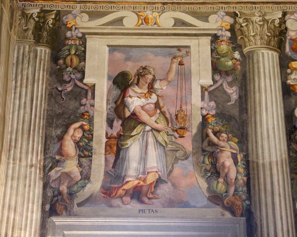 Curator: Here we have Alessandro Allori's "Justice," painted in 1582. It’s an allegorical representation, rendered with fresco technique. What's your immediate take? Editor: Well, there’s a serene balance at play. The central figure dominates, but there’s also a curious dreaminess to the cloud-like background. It's interesting how the putti introduce this sculptural dimension, complicating the fresco's flatness. Curator: Indeed, Allori uses this fresco to communicate values esteemed at the time; he employs specific colors and compositional structure to impart meaning. Let's examine how "Justice", holding the scales and a crown, is depicted, literally weighing power, earthly and divine. It reflects Renaissance humanism but already hints at Mannerism. Editor: The depiction, naturally, serves the social function of visually communicating Justice in 16th-century Florentine society. I am also very intrigued by the setting, this integration of painting, sculpting, and even what seems to be architectural setting. Curator: Precisely. Structurally, her pose creates an upward visual momentum, from the drapery's swirl to her gaze. And how that is counterweighted by the putti on either side and tied together with a garland decoration is just fabulous. Editor: And the fruit around those flanking putti really speaks to me. The bounty of the earth tied to justice, law and order. Perhaps meant to demonstrate how justice delivers good governance to people. That’s also hinted at by the fact that the clouds become more present beneath her feet in the picture, as if a solid ground for Justice doesn’t really exist. Curator: The symbolic resonances ripple outward. And the cool tonality certainly affects the reading of justice here; this feels balanced and calm, not fiery. Editor: This restrained palette, as opposed to something more forceful, certainly feels calculated to suggest the thoughtful deliberation necessary for true justice. It moves beyond raw power. Curator: An interesting blend of aspiration and aesthetic restraint; I see this work anew considering your thoughts on societal norms reflected by colors and depictions. Editor: And reflecting on your examination of color choices has brought new dimensions to my understanding of Justice here too. A fruitful interpretation for both of us, I would suggest.
