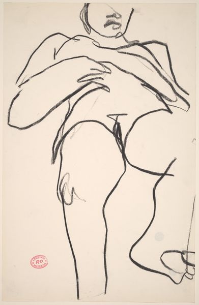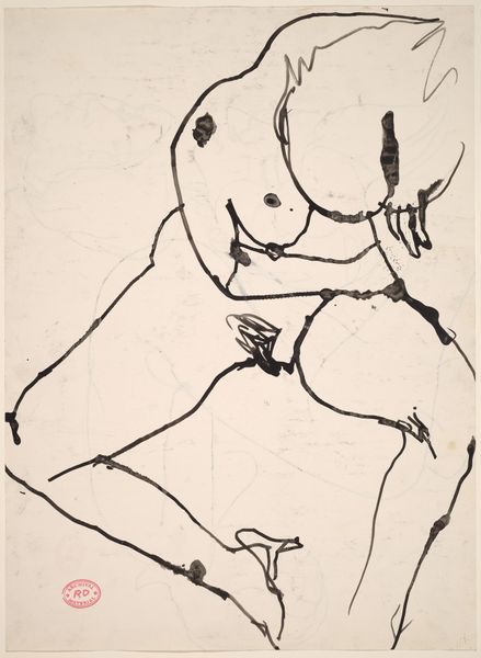 Editor: This is Paul Gangolf's "Seated Female," created in 1929 using woodcut and ink. It has such a stark, graphic quality because of the high contrast. The woman's expression also gives me pause... What do you make of it? Curator: The work exemplifies an expressionist style. The bold lines, simplified forms, and stark black-and-white contrast are notable. Consider how Gangolf employs the materiality of the woodcut. The gouges and ridges carved into the block determine the image. The physical act of carving itself becomes integral to the artwork’s meaning. Editor: So, it's less about realistic representation and more about the physical process and the strong contrasts it creates? How does that choice impact our understanding of the subject? Curator: Precisely. The distortion of the figure, those angular features and the lack of naturalism, communicate something beyond mere appearance. It's crucial to consider what the abstraction conveys through shape and form. Editor: It feels almost like she is trapped in her emotional landscape! What should viewers take away from this composition and treatment? Curator: Reflect upon the lines – both those that define her body and those that construct the claustrophobic setting. Then consider how texture contrasts against smooth surfaces. Ask yourself what Gangolf’s choices reveal. Is he inviting empathy, or offering a commentary on alienation through compositional choices? Editor: The interplay of textures makes sense! I now look at how much the formal choices add to an uneasy emotion within the figure. I appreciate your taking me through the textures and composition to bring the feelings to light! Curator: Likewise; it is through precisely such engagement that these artworks endure, by demanding that each viewer reflect upon its elements of form.