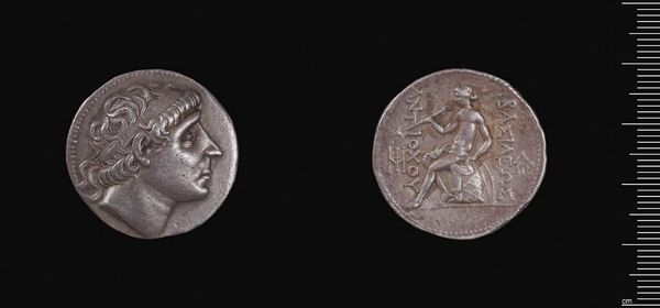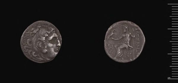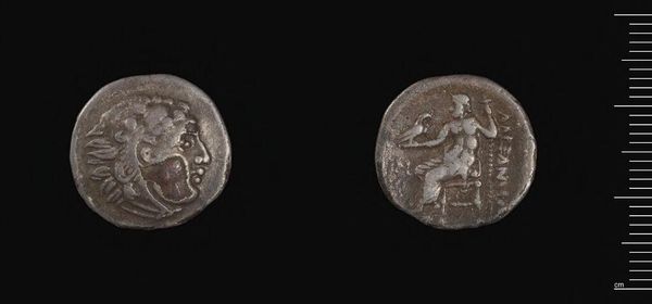 Curator: This is a silver tetradrachm, minted in Lampsakos under Lysimachos of Thrace. Editor: It's striking, even at this scale. The detail in Alexander's hair is remarkable. It makes me think about power, and how it’s projected through imagery. Curator: Absolutely. The coin features a deified Alexander the Great, with the ram's horns of Zeus-Ammon, embodying divinity and kingship. Editor: And on the reverse, Athena Nikephoros, a symbol of victory, reinforces that message of power and control. But who is that victory for? Curator: Coins like these were vital tools for rulers. Lysimachos used them to legitimize his rule, associating himself with Alexander’s legacy. Editor: A legacy built on conquest, though. It prompts us to consider whose stories are amplified and whose are erased through these symbols of authority. Curator: Indeed, it's a reminder of the complex interplay between art, power, and historical narrative. Editor: Precisely. This small coin carries a heavy weight of history, demanding we question the narratives it promotes.