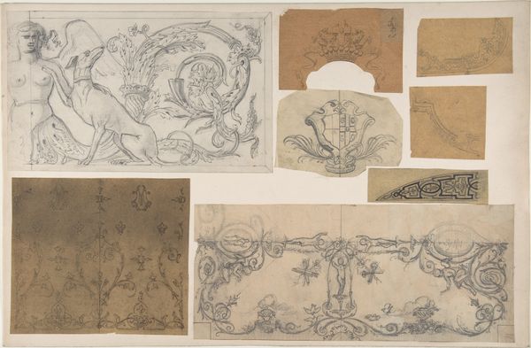 Curator: This is a fascinating collection from between 1875 and 1900, called "Six Photo Reproductions of Ornament Drawings, Likely Wall Decorations." They're rendered using a mix of graphic arts like lithography and etching, all on paper. What leaps out at you, immediately? Editor: Frivolity. That’s the word. A sort of charming visual cacophony. Tiny figures climbing up twisting vines and urns overflowing with… stuff. It's like looking at the architectural equivalent of cotton candy. Curator: Cotton candy, yes! They evoke such a tactile sense, don't they? These miniature designs showcase a real preoccupation with form, leaning heavily into the decorative arts style. What intrigues me is the anonymous nature of the artist—makes you wonder who dreamt these up, and for what grand space? Editor: The lack of a signature lends an air of universality. These patterns feel less like personal statements and more like templates, modular pieces that could be adapted for countless spaces. The precision of the line work is mesmerizing, each swirl and flourish meticulously rendered. The composition seems intended to draw the eye upwards, to create an illusion of height. Curator: Right? The eye certainly travels. Imagine these adorning the walls of a grand salon, maybe framing mirrors or doorways. Each reproduction seems to dance with a unique energy, from the playful asymmetry to the rigidly structured patterns. Editor: Absolutely. Notice, too, how the reproductions echo one another, despite their variations. Motifs recur—vases, figures, swirling tendrils—creating a visual rhythm across the whole arrangement. A dialogue, of sorts, between ornamentation and utility. They are forms hinting to me a certain tension between surface embellishment and underlying architectural function. Curator: So well observed. To think of the hours poured into each line, each carefully placed detail. It whispers to me of artistry intertwined with functional beauty and creative dreams intended to bring joy and life to those who dwell within those walls. Editor: Yes, indeed. Ultimately, though unsigned, this collection of ornament studies serves as a valuable resource for decoding an era where design was deeply intertwined with art.