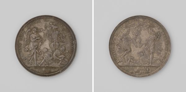 Curator: Let's have a look at this "Nieuwjaarspenning op de zorgelijke toestand in de Nederlanden 1745," a Dutch medal made in 1745 by Nicolaas van Swinderen. What strikes you first? Editor: The worn metal speaks volumes. The low relief and the subtle scratching seem like tangible anxiety, reflecting the disquieting theme embedded in its symbolism. Curator: It’s quite intricate. On one side we have the scales of justice, and various symbolic elements like what looks like a serpent under them, evoking instability. Editor: Made of what, likely silver? That gleam against tarnish is suggestive of both hope and corruption... Did the original commissioner specify silver for that purpose, or was the decision tied only to material access and social signaling? Curator: That's interesting! These "Nieuwjaarspenningen," New Year's Pennies or Medals, often carried allegorical meanings reflective of the past year and hopes for the new one. Here, we see a balance disrupted, signaling the "zorgelijke toestand," the troubled state of the Netherlands, a commentary through carefully chosen visual vocabulary. Editor: The making would’ve required meticulous hand-crafting, wouldn’t it? From die-cutting to engraving those minute allegorical details. The embodied labour itself adds meaning, doesn't it? Think of the craftspeople involved, their own financial situations, perhaps precarious amidst this national worry. Curator: Absolutely. And on the reverse, a Dutch lion, also rather worn, sits beside an altar with light emanating. It projects the continuity and endurance of Dutch identity amidst turbulent times. The iconography underscores the wish for national recovery and divine intervention. Editor: Beyond allegory and social commentary, the artifact points directly to production and circulation; someone minted this, someone purchased this, and others looked at it and understood—or misunderstood—the weighted symbols, so fraught with political context. Curator: The nuances captured in this small object truly illuminate the mindset of the time, revealing an era teetering between crisis and hope. It reminds us that collective sentiment often finds unique expression. Editor: Exactly, a seemingly simple metal object reveals complex historical realities. The physical experience of holding such an object today deepens that connection, making the past almost... palpable.