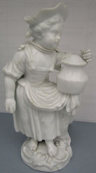 Editor: This is an intriguing porcelain sculpture called "Woman," created sometime between 1735 and 1745. Its delicate and diminutive size almost makes it feel like a secret, a miniature monument to femininity from the Rococo era. The all-white glaze is simple but elegant. How do you interpret this work in terms of symbolism? Curator: I’m struck by how such a seemingly simple form can hold such weight. White porcelain in this period signaled purity and refinement but also luxury. How might that contrast with the "commonness" implied by the subject matter – a woman, seemingly caught mid-task? Does her outfit, with its casual drapery, also hold clues about the expectations placed upon women? Editor: So the symbolism is complex and nuanced. Curator: Exactly. The figure’s pose also offers clues. Consider the way she is holding her apron. It isn’t simply functional. It seems almost like a performance. The very fact that it’s rendered in porcelain elevates this moment. Does this not bring up ideas about beauty in the mundane, and how class distinctions affect daily life? Is it possible that this figure is enacting a pose meant for nobility, an almost satiric, perhaps unconscious performance of gendered privilege? Editor: I never thought about it that way! It is like a play being performed. What strikes me most now is the quiet rebellion against expectations. Thank you, this has given me so much to think about. Curator: And for me too, considering the lasting power objects carry and how their meanings shift with time.