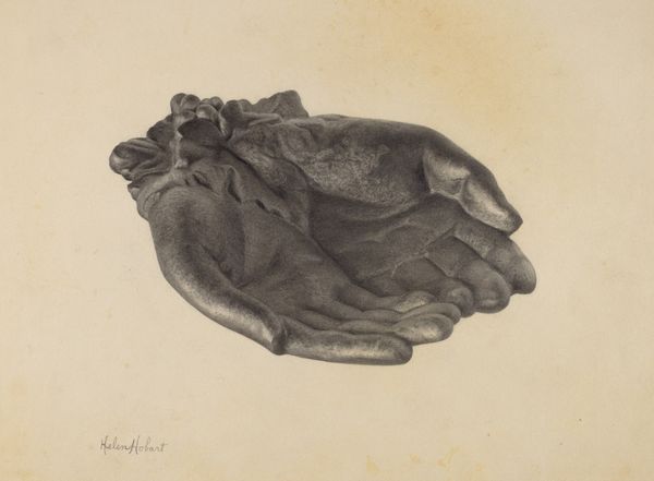 Curator: This compelling drawing is titled "Shoe" and was created sometime between 1935 and 1942, the artist is unknown. It's rendered in pencil on paper. The simplicity of the medium underscores the subject matter. Editor: It's a lonely object, isn’t it? There's a somber quality, despite its humble subject. The muted tones lend an antique feel, a sense of faded memory. Curator: Certainly, the realism leans toward melancholic representation, quite unlike, say, Surrealist depictions that might explore shoes in more provocative ways. Considering the artwork was produced between the mid-30s and early 40s, we might understand "Shoe" as a commentary on everyday lives affected by political conflict. Editor: Possibly. Shoes carry powerful cultural weight, signifying journeys, status, or gender. The sole is quite worn down. Does it indicate weary footsteps or is it just a rendering of lived experience during these difficult years of war, but in more metaphoric ways? Perhaps, the laced strings suggest attachment or constraint... or the ties that bind society, which appear delicate, on the verge of tearing apart. Curator: That’s a valid observation, I’d like to think about its role for anonymous portraiture during this period. Focusing on personal items makes the symbolic weight more about a personal reflection, rather than a social commentary about the implications of class and mass production for other works. Editor: It reminds me how mundane items often become poignant symbols during moments of upheaval. Curator: Indeed. The historical weight combined with the intimate scale invites us to consider both the grand narrative and the quiet resilience of everyday life during such transformative times. Editor: Yes, I think I understand its gravity a little better now. It's about those uncelebrated journeys. Curator: Ultimately, it reminds us that art doesn't need grand gestures to speak profoundly to our shared history.