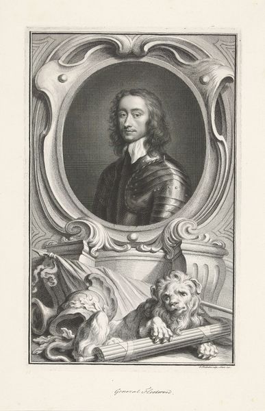 Editor: This is Jacobus Houbraken's portrait of Lieutenant General Charles Fleetwood. The stark black and white, and the intricate detail, create a sense of formidable power. What stands out to you in its composition? Curator: The engraving is a fascinating study in contrasts, is it not? Note the sharp delineation between light and shadow, creating depth and volume. The ornate frame juxtaposes with the subject's direct gaze, a tension between ostentation and austerity. Editor: So, the frame isn't just decorative. It’s part of the statement? Curator: Precisely. It is a crucial element in understanding how the artist wants us to perceive the subject. Consider the deliberate use of line and form. What does it tell us about the values of the time? Editor: I see now, the lines create a really complex interplay between the figure and the setting. Thanks for pointing that out! Curator: A fruitful analysis, indeed.