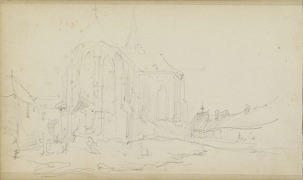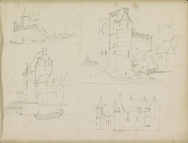 Curator: Welcome! We’re looking at a page from Adrianus Eversen's sketchbook. The title is “Twee landschappen en een gezicht op een kasteel of buitenplaats,” which translates to “Two landscapes and a view of a castle or country house.” It’s believed to have been made sometime between 1828 and 1897. Editor: My initial impression is of ephemeral studies, moments captured lightly in pencil. The artist focuses on tone, building layers of shadow that describe the forms with the utmost efficiency. Curator: Exactly! The aged, toned paper and the style really lend this work a sense of the era it comes from. Eversen worked during a time of significant urban development, and the rising middle class saw sketches such as these documenting landscapes as picturesque scenes. The act of sketching landscapes like these becomes an expression of cultural identity. Editor: The compositions are really interesting, each vignette offering a slightly different perspective. The soft lines really enhance the natural light that illuminates these spaces, but also abstracts and highlights line quality. It allows him to emphasize elements and even distort certain spatial relations to great expressive effect. Curator: And we see hints of that historical and societal element that Eversen taps into here; these are depictions that show an increasingly urban audience their past! The estates that they come from are idealized—that allows them to carry that extra emotional resonance with that audience. Editor: Yes! Look at the subtle variations in hatching and the density of lines in each rendering. Each conveys such precision and accuracy. His quick and effective technique beautifully illustrates the structure of a scene. Curator: It is truly compelling when one sees how artistic practices play into historical memory and the development of shared public identity! The pencil work, aged paper… Editor: ...allows him to emphasize spatial relationships by making light of what truly makes these elements so architecturally inspiring. What is not rendered with extreme clarity almost adds a further layer of emotional appeal. Curator: It just shows how we, as both a culture and even a museum as a reflection of it, determine meaning. Editor: Right—we each extract different aesthetic values when considering elements like those represented on the page, making each viewing deeply personal.