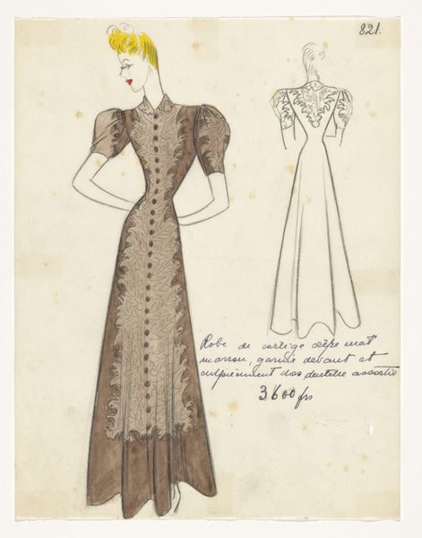 This is Jean Dessès's "Robe du soir de taffetas noir," a fashion sketch rendered in pencil and watercolor, exploring form and texture. The dark dress against the pale background immediately draws the eye, creating a striking contrast. Dessès plays with the interplay between the figure and the gown, as well as the gown and the page. Note how the dress, constructed from a cascade of layered taffeta, creates a complex interplay of light and shadow. The choice of black taffeta is crucial here. Its reflective quality allows Dessès to model the form and give it volume. The semiotic weight of black, often associated with elegance and formality, reinforces the garment's intended purpose as an evening gown. The sketch destabilizes the traditional boundaries between fashion illustration and fine art. It functions as a design proposal, and a study of form. Consider how Dessès uses line and shading to evoke the dress's tactile quality, the very essence of haute couture. The sketch serves as both a blueprint and an invitation to imagine the dress in motion. The emphasis on texture and form speaks to the broader cultural interest in materiality. The sketch invites ongoing interpretation regarding fashion, representation, and artistic expression.
