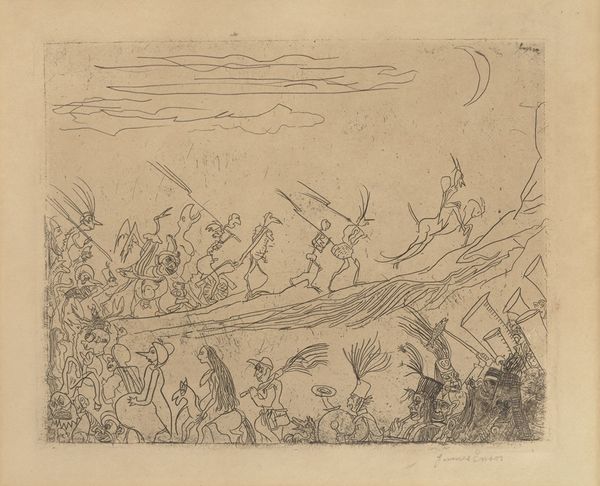 Editor: This is George Hendrik Breitner’s “Wild Boar Hunt and Two Drunks,” a pencil drawing from 1873. It has a whimsical, almost satirical feel, with a frenzied boar hunt on one side and two somewhat out-of-place revelers on the other. What do you see in this piece, beyond the literal depiction? Curator: I see a critique of class and leisure. The hunt, traditionally a pastime of the aristocracy, is juxtaposed with the apparent drunken revelry of figures who, based on their attire, seem to represent a different social stratum. What does it mean to portray both activities, each a form of leisure, within the same frame, particularly under the gaze of that almost mocking sun? Editor: That's an interesting point – almost like contrasting forms of escape, or even commenting on excess. I hadn't thought of it in terms of social critique. Curator: Breitner often used his art to observe and, at times, subtly challenge the social norms of his time. Consider the composition – the chaotic energy of the hunt versus the seemingly carefree abandon of the drunkards. Is he suggesting a moral equivalence, or perhaps highlighting the inherent absurdity in both pursuits? And consider the sun, which bears an uncanny resemblance to depictions of caricatures during this era that are thought to depict society’s elite as bloated, lazy, or disconnected from any actual productivity? Editor: So you see the sun as almost a critical observer, adding another layer to the social commentary? I was focused on the figures and missed the other nuances. Curator: Exactly. Art doesn’t exist in a vacuum; Breitner, as a realist, was reflecting the world around him, with all its inherent inequalities and contradictions. I wonder about our emotional response - which scene feels more transgressive, and why? Editor: Now that I think of it that way, I have a lot to think about. Thanks, I now look at the image quite differently, and really appreciate how art embodies and influences societal power structures. Curator: Indeed. By analyzing art through these lenses, we gain a deeper understanding of its cultural impact.