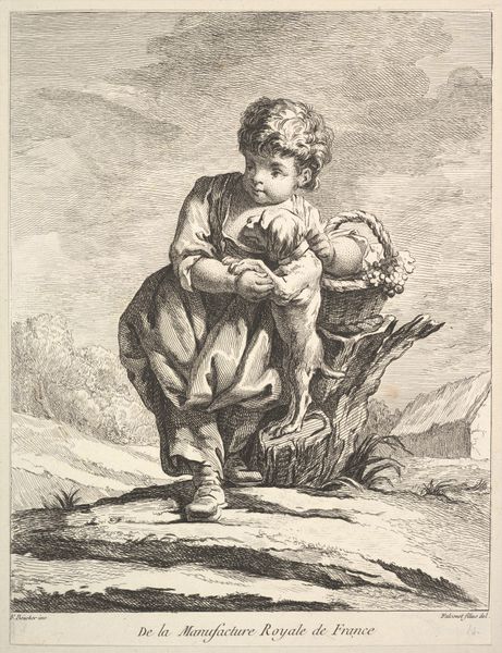 Pierre François Tardieu's engraving shows a boy holding a basket overflowing with grapes, echoing themes of abundance and youthful innocence. This image, like others of its time, draws upon a deep well of classical motifs, specifically Bacchus, the god of wine and fertility, often depicted with grapes and vines. Consider how the grape motif appears in Roman mosaics or Renaissance paintings, symbolizing not only earthly pleasures but also divine grace and sacrifice. In Christian iconography, grapes are tied to the Eucharist, representing the blood of Christ. Tardieu's image captures the evolution of these symbols, distilling them into a charming, secular scene, yet hinting at the deeper layers of meaning. The innocent depiction of the boy evokes a sense of nostalgia, tapping into a collective memory of pastoral ideals. It presents an emotional, psychological space where the viewer may contemplate the cyclical nature of life, death, and rebirth. The image becomes a potent reminder of cultural memory, resonating across time.