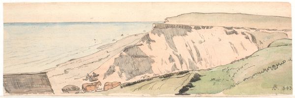 Editor: So, this is Johan Thomas Lundbye's "Klinten på Refsnæs," a watercolor and drawing from 1843. I find it quite striking, almost monumental, despite its relatively small size. How would you interpret this work? Curator: The cliff itself takes on a mythic presence. Notice how Lundbye uses light and shadow, creating strong vertical lines which are suggestive of a Gothic cathedral reaching for the heavens. Consider that this was made during the Danish Golden Age of painting, a period defined by explorations of national identity. The cliffs could symbolize the enduring strength and resilience of the Danish landscape. What feelings does the imagery evoke in you? Editor: Definitely a sense of timelessness, and maybe even isolation. The lone cliff standing against the sea… Curator: Precisely. But it's more than just isolation; it’s a potent symbol of connection to a specific place and past. Water imagery is profound; have you considered the importance of the sea as a signifier? Editor: I hadn't thought about the sea specifically... as a force of change perhaps? Curator: The sea represents both constant change and the enduring flow of history and tradition. Lundbye may suggest our relationship to our ancestral lands. Are we not a product of both the land and the water that surrounds us? In essence, do you consider landscape in terms of nation-building? Editor: That gives me a lot to consider; I see that it's less of a landscape "painting," and more of a painting "about" landscape. Curator: Indeed. Through close examination of visual symbols like this we gain access to shared cultural memories.