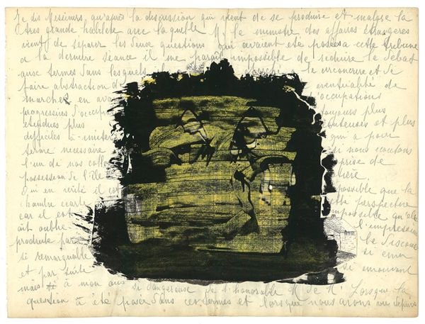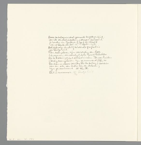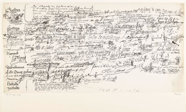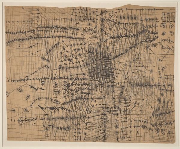 Editor: Here we have Sol LeWitt's "The Location of 14 Points," created in 1975 with ink on paper. It's quite busy, with geometric lines overlaid on seemingly random handwritten text. What do you see in this piece, beyond just the visual chaos? Curator: Chaos is an interesting starting point. I see a rigorous system attempting to grapple with, perhaps even contain, something inherently fluid: language itself. Look at how the lines dissect and frame the text, imposing order on what might be diary entries or fragmented thoughts. It evokes a sense of surveillance, of mapping the intangible. What does the intersection of personal narrative and rigid structure tell us about the society, say, of 1975? Editor: Surveillance? That's a strong word. I hadn’t thought about it like that. I just saw geometric abstraction mixed with text. Do you think there is a commentary about the relationship between public and private? Curator: Absolutely. Conceptual art often engages with those boundaries. The geometric forms – simple, almost bureaucratic – attempt to codify subjective experience. Think about how systems of power categorize and control individuals. LeWitt, I believe, is making that power dynamic visible. He transforms the personal into data points. But let's consider this more specifically: whose experiences get codified, whose get erased? Editor: So it's less about the math and more about what the math *does*? A little like Foucault’s ideas? Curator: Precisely. Think about the panopticon. Or, more broadly, how knowledge systems are constructed to legitimize specific narratives. This piece invites us to critically examine what those narratives are, who benefits from them, and what gets left out. How would our understanding shift, do you think, if we knew who wrote those texts, their gender, their race, their class? Editor: That puts everything in a completely different light. I initially just saw lines and text but now I'm considering it in a socio-political context. I think I understand this much better now. Curator: Excellent. Art becomes truly potent when it pushes us to see beyond the surface, to engage with the complex interplay of power and representation.