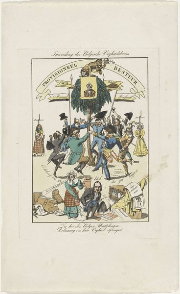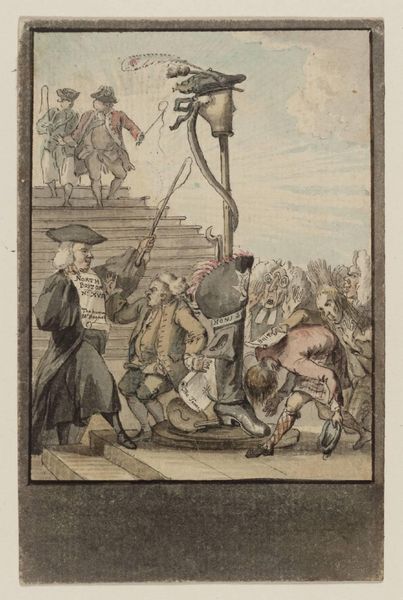 Curator: Welcome. We’re looking at "The Giant Factotum Amusing Himself," a print made by James Gillray, possibly in 1797, using etching, engraving, and aquatint. Editor: First thought? Wicked. There's a sense of absolute, gleeful power here. Like watching a cat play with a very unfortunate mouse. The towering figure just dominates everything. It feels theatrical and cruel. Curator: Gillray was a master of political satire, and this print exemplifies his skill. “Factotum” here refers to someone who can do everything, and the giant, often interpreted as William Pitt the Younger, embodies centralized power. The scene mocks the political landscape of the time, especially Pitt’s dominance. Editor: See, history! But to me, even without the context, that imbalance is so striking. The sheer SIZE of the main figure— legs straddling the whole scene, dwarfing those little guys scrambling around like ants. There’s something both comical and terrifying about it. A delicious kind of fear, perhaps. Curator: Note the deliberate chaos. The crowd, the fallen figures – it's all carefully staged to underscore the sense of disruption and authoritarianism. Gillray's prints circulated widely, shaping public opinion and challenging those in authority. He made the political personal. Editor: Exactly! He turns power into something… almost slapstick? It’s like the grandest, most ridiculous puppet show ever conceived, but with real-world consequences. Do you think Gillray saw it this way? Like life is essentially a farce being run by inflated egos? Curator: Given the frequency and pointedness of his satirical attacks on figures like Pitt and the royal family, it’s safe to say that he felt some degree of… skepticism toward the established order. His caricatures were, after all, biting social commentary disguised as humor. Editor: Disguised indeed! Gillray doesn't so much disguise as throw a massive spotlight on the absurdity of it all. Thanks to that unflinching eye, "The Giant Factotum Amusing Himself," continues to amuse... and sting. It's the kind of image that lingers, provoking all sorts of wonderful and uncomfortable questions. Curator: It reminds us of art's potential to disturb, to provoke dialogue, and to make us reconsider power structures. Thank you for offering such a creatively rich reading!