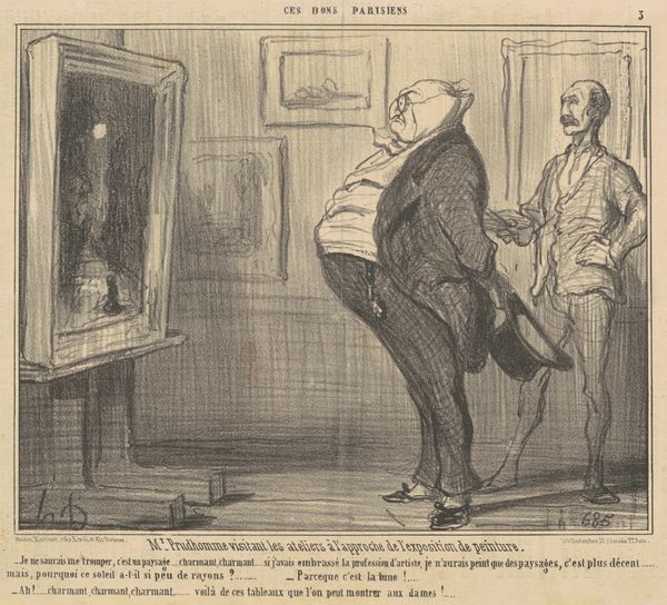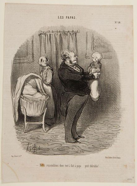 Curator: Daumier’s lithograph, "Ah! Ciel, ma plus belle potiche!..." made circa 19th century, presents such a theatrical scene. I'm struck by how he captures a domestic disaster with a comedic flair, even in a simple black and white print. What's your take on it? Editor: It definitely feels like a comedic scene, a disastrous moment frozen in time. The expressions are priceless. The broken vase, I think, is a good indication that the title has some kind of deeper significance. Can you share what is that you find compelling about this print, and perhaps its relevance to the social context of its time? Curator: It’s fascinating to consider what Daumier is satirizing. The title gives us a clue – “potichomanie.” In 19th-century France, crafting and displaying decorative objects like these porcelain vases was becoming increasingly popular among the bourgeoisie. It signified a certain aspiration to cultured leisure. Where do you think that information fits into what Daumier might be satirizing here? Editor: So the broken vase isn’t just a loss, but a loss of social status almost? A failed attempt to signal taste and sophistication? And the melodrama highlights the absurdity of valuing such objects so highly? Curator: Precisely! Daumier, known for his social critiques, often targeted the pretensions and anxieties of the middle class. He questions the social climbing facilitated by "Potichomanie." Also, how does the visual composition—the exaggerated gestures and almost caricatured faces—play into this social commentary? Editor: The exaggerated gestures, it’s over-the-top. The figures aren’t just sad, they are devastated and furious which enhances the comedic effect while simultaneously exposing the triviality of their concern. Curator: Exactly. And how might museums and galleries have, even back then, played a role in elevating and therefore legitimizing the tastes and trends Daumier skewers here? Editor: Right. By exhibiting similar decorative objects, galleries reinforced their perceived value, contributing to the “mania.” I am starting to wonder, how much of today's trends are tomorrow's parodies? Curator: It is a very insightful parallel to the role art continues to play in signaling and shaping social status and aspiration. Food for thought, definitely. Editor: Absolutely, that was really helpful in unpacking the layers of meaning in Daumier’s print.