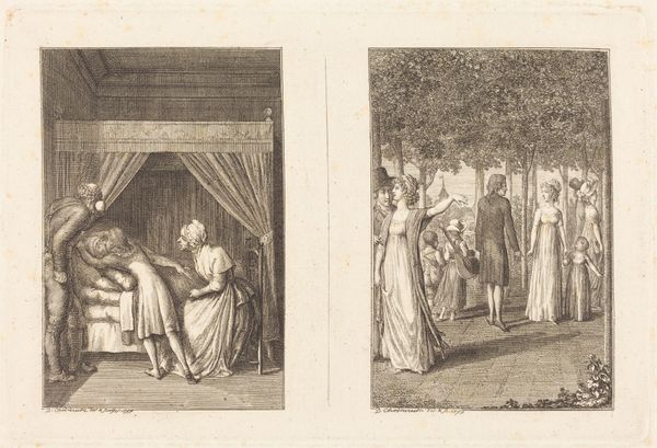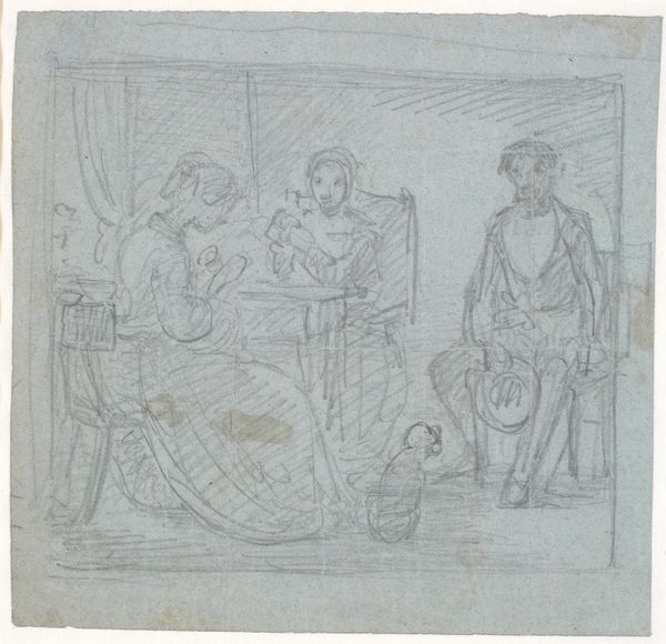 Curator: Welcome. Here we have Wilhelm Marstrand’s "Et k\u00f8benhavnsk hjem", or "A Copenhagen Home", made sometime between 1810 and 1873. This expressive ink drawing provides a window into the domestic life of the period. Editor: It strikes me as a quick sketch, almost fleeting, despite the rather formal arrangement of the figures. There's a remarkable economy of line here; you can feel the artist's hand moving swiftly across the paper. Curator: Indeed, the sketch-like quality adds to its intimacy. We see a family or gathering of some kind, rendered with an immediacy that invites us to consider their roles and relationships within the context of 19th-century Danish society. The gendered expectations of the women sitting together versus the lone man is something I think we can unpack further. Editor: Absolutely. And the choice of ink, with its varying tones and textures, lends itself to a very specific, somewhat austere mood. One wonders about the availability of materials to the artist. The weight of each stroke seems considered. Curator: Consider also the socio-political context. This was a time of burgeoning nationalism and evolving notions of domesticity and gender roles in Denmark. Genre paintings, like this, reflected and shaped these cultural currents. It portrays not just a family, but a burgeoning concept of the Danish family and identity. Editor: It's fascinating how much information he conveys with so little. You see how the light falls on their dresses, implying texture, a subtle suggestion of labour dedicated to crafting those garments, which speaks to production in the fashion and textile industry, impacting class and the rise of industrial production within this era. Curator: Precisely. And note the limited details in the background, focusing our attention on the figures themselves. We’re compelled to interpret their poses and expressions as markers of social identity and emotional states. Editor: It’s incredible how Marstrand utilizes such rudimentary resources to construct meaning that persists to this day. Curator: A poignant snapshot offering many different, intersecting narratives of Danish society at the time. Editor: An interesting glimpse into art production through sparse materials.
